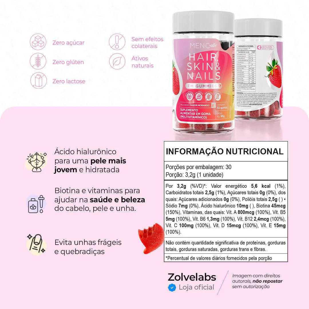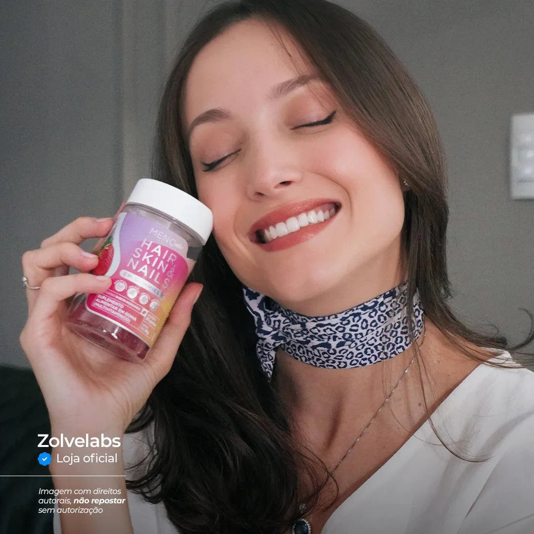 O Gummie Hair, Skin & Nails da Zolve é um suplemento mastigável desenvolvido para dar suporte à saúde e beleza dos cabelos, unhas e pele. Formulado com biotina, ácido fólico, vitamina c e ácido hialurônico, proporciona um cuidado completo em um formato delicioso e prático.