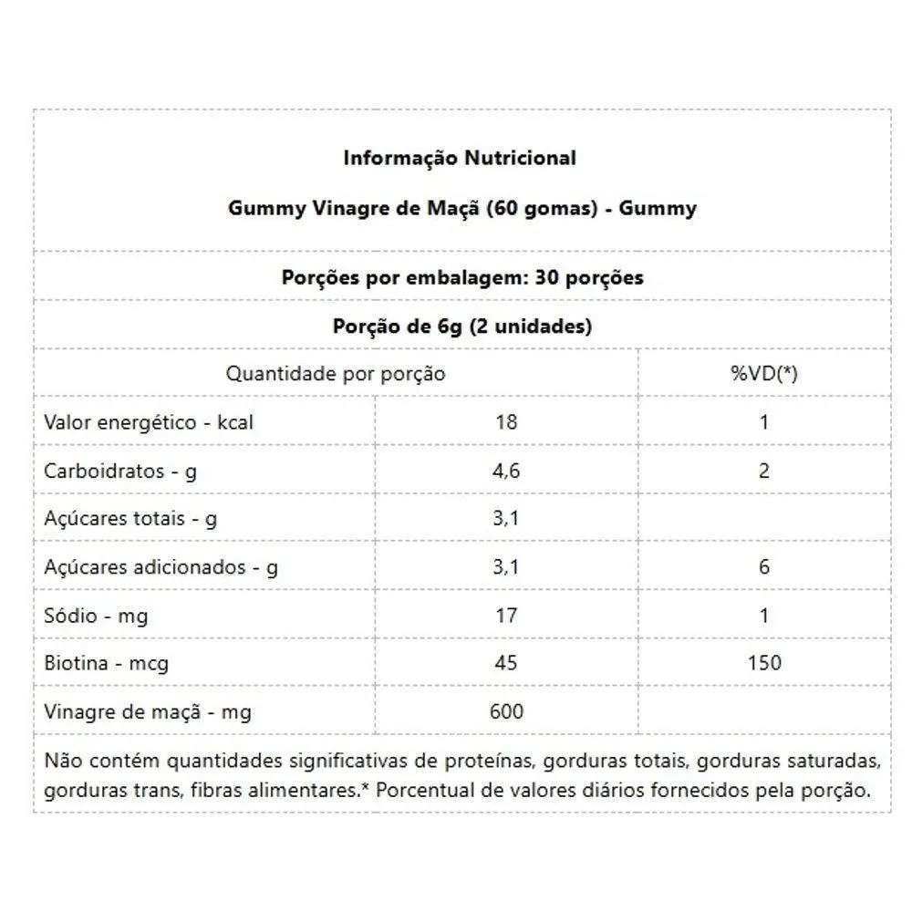 Gummmy Apple Cider Vinegar (60 gomas) Experimente o poder do vinagre de maçã! Já pensou no vinagre de maçã como um grande aliado da sua saúde? Estudos mostram que além de ajudar a reduzir a absorção de gorduras, esse ingrediente milenar contribui para uma maior sensação de saciedade e auxilia na manutenção de níveis saudáveis de colesterol. Gummmy Apple Cider Vinegar é uma forma prática, saborosa e segura de consumir diariamente os benefícios do vinagre de maçã. Qual a melhor forma de consumir o Vinagre de Maçã? O consumo do vinagre de maçã em sua forma pura tem ótimos benefícios, mas tem sabor desagradável e sua acidez pode causar danos ao estômago e aos dentes. O Gummy Apple Cider Vinegar é prático e delicioso: recomendamos ingerir diariamente 2 gominhas para obter o melhor do vinagre de maçã sem os efeitos colaterais da versão tradicional. Benefícios: * Ajuda a reduzir a absorção de gorduras. Estudos mostram que o ácido acético presente no vinagre ajuda a inibir enzimas digestivas responsáveis pela quebra de carboidratos no intestino, reduzindo a quantidade de calorias absorvidas dos alimentos; * Ajuda a manter a saúde de cabelo, pele e unhas. A biotina participa da produção de queratina e ceramidas, que favorecem o crescimento saudável de cabelos e unhas, e colaboram com a saúde da barreira de proteção da pele; * Auxilia na manutenção de níveis saudáveis de colesterol. O vinagre de maçã colabora para reduzir os níveis de colesterol e triglicerídeos, fatores que favorecem a melhora da saúde vascular. * Favorece uma boa digestão. Por ser um ingrediente rico em fibras e ácidos, o vinagre de maçã facilita o processamento dos alimentos no trato digestivo, podendo diminuir sintomas como estômago pesado no período pós-refeição. * Contribui para uma maior sensação de saciedade. O vinagre de maçã contém fibras solúveis, como a pectina, que ajudam a prolongar a saciedade das refeições e reduzir a fome.