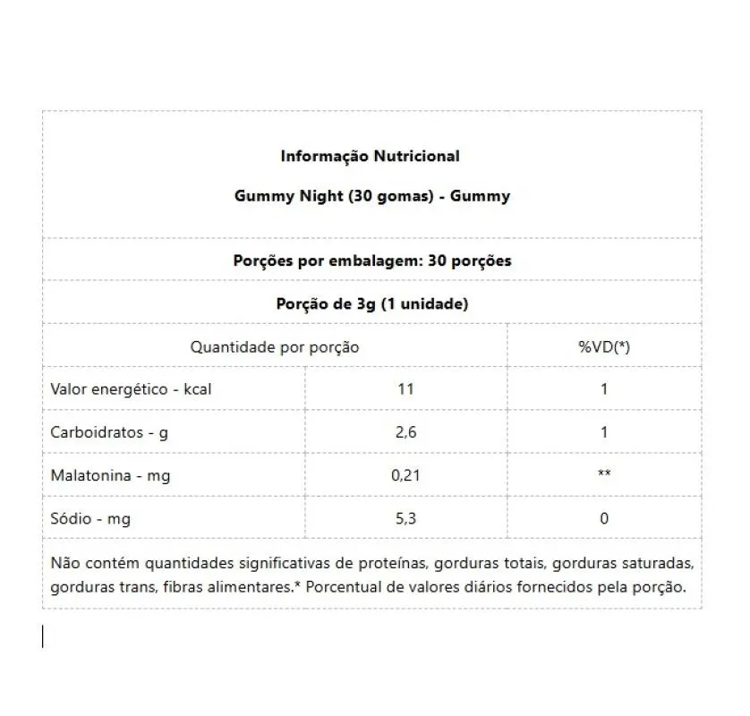 Gummmy Night (30 gomas) Sua qualidade de vida começa pelo sono Uma boa noite de sono é o primeiro passo para ter dias com mais energia, foco e bom humor. Gummmy Night conta com a melatonina para te ajudar a desfrutar de noites de sono mais tranquilas, na dose certa para não representar riscos para a saúde. Tudo isso com o sabor, a praticidade e a performance da Gummy! Qual a melhor forma de consumir o Gummmy Night? Gummmy Night transforma a suplementação de melatonina em uma experiência saborosa e eficaz desde a primeira noite. Recomendamos a ingestão de 1 gominha enquanto você se prepara para dormir. É fácil lembrar da sua dose diária com uma gominha tão prática e deliciosa! Benefícios: - Favorece todas as fases do ciclo do sono - Uma das funções da melatonina é conduzir o organismo para o repouso noturno através da indução e manutenção do sono de qualidade. - Ajuda a regular o relógio biológico - As rotinas fisiológicas do corpo são beneficiadas pela presença da melatonina durante a noite, favorecendo a regularização do metabolismo. - Contribui para a preservação das células - A melatonina age como um antioxidante no organismo, que ajuda a limpar as toxinas e radicais livres das células durante o sono. - Não dificulta o processo de acordar - Os níveis de melatonina diminuem automaticamente com a incidência da luz do dia, induzindo naturalmente o organismo para suas atividades diárias.