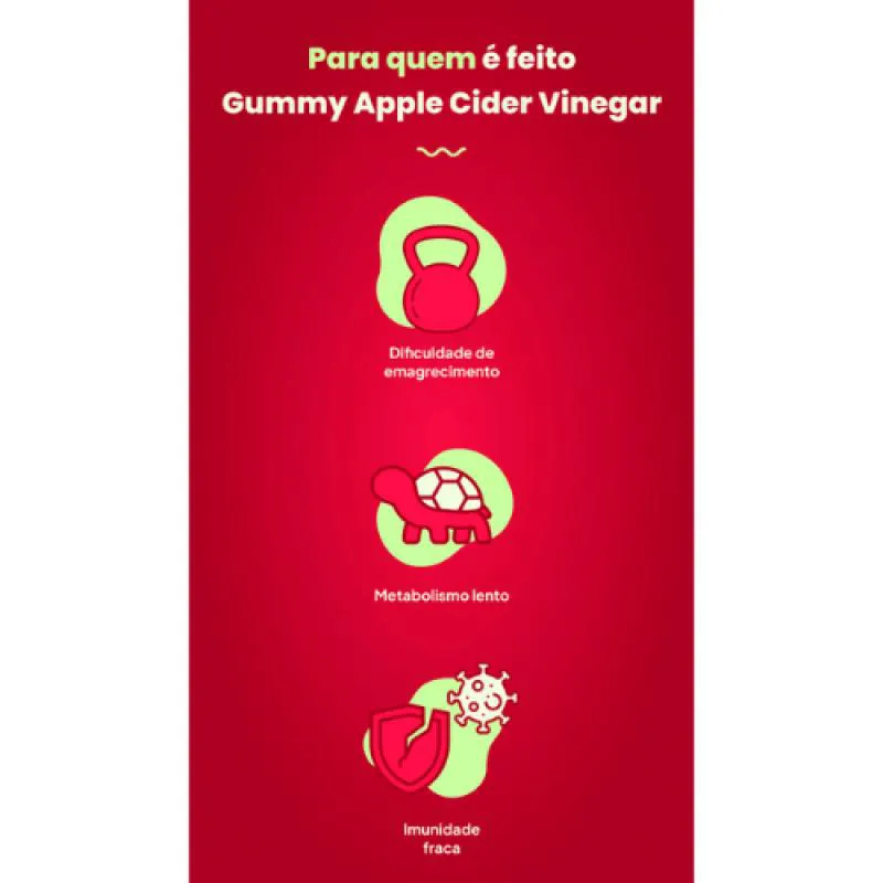Gummy Apple Cider é um suplemento alimentar em gomas sabor cereja, feito com vinagre de maçã e enriquecido com vitaminas essenciais. Ideal para quem busca os benefícios do vinagre de maçã de forma prática e saborosa, sem o gosto ácido tradicional. Com 60 unidades por pote, esse suplemento auxilia no equilíbrio digestivo, controle do apetite e aumento de energia diária.Perfeito para incluir na rotina com prazer e bem-estar!