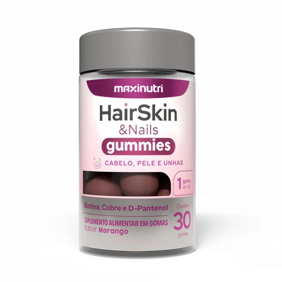 Suplemento HairSkin Gummies 30 Gomas Maxinutri em sabor morango. Fórmula com biotina, vitaminas e minerais que auxiliam na saúde do cabelo, pele e unhas. Fortalece fios, promove brilho e hidratação e contribui para a formação de colágeno. Ideal para rotina de beleza diária. Benefícios do HairSkin Gummies: Saúde dos Cabelos Contribui para a manutenção dos fios mais fortes e resistentes Ajuda no brilho e vitalidade do cabelo Biotina e zinco auxiliam no crescimento saudável Pele Mais Bonita vitamina c contribui para a formação de colágeno Ação antioxidante que ajuda a proteger a pele Promove aparência mais hidratada e radiante Unhas Fortes Combinação de vitaminas do complexo B e minerais fortalece unhas frágeis Reduz a quebra e descamação Apoio Nutricional Completo Vitaminas A, B1, B2, B6, B12 e ácido fólico para melhor funcionamento metabólico Selênio com ação antioxidante Formulação em goma sabor morango de fácil consumo Praticidade e Paladar Suplemento em formato gummy: gostoso e fácil de incluir no dia a dia Ideal para quem tem dificuldade em engolir comprimidos