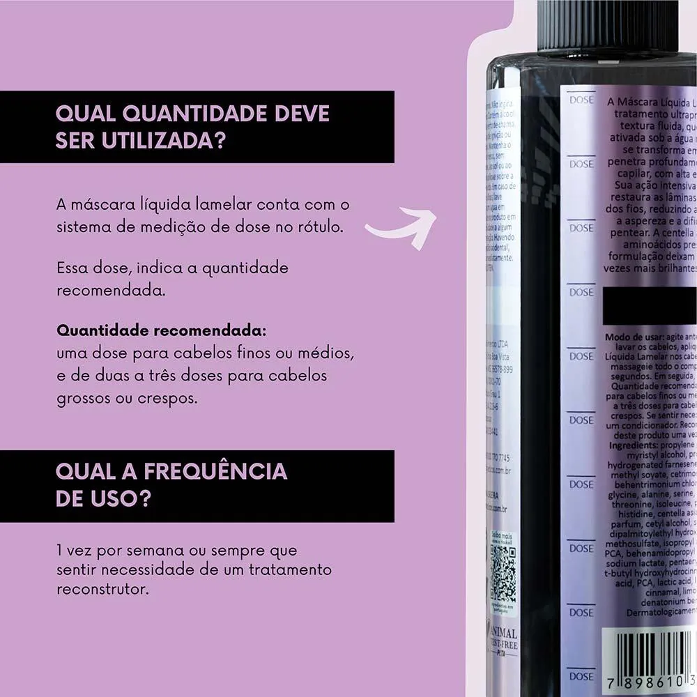 A máscara líquida lamelar conta com o sistema de medição de dose no rótulo. Essa dose, indica a quantidade recomendada. Quantidade recomendada: uma dose para cabelos finos ou médios, e de duas a três doses para cabelos grossos ou crespos.