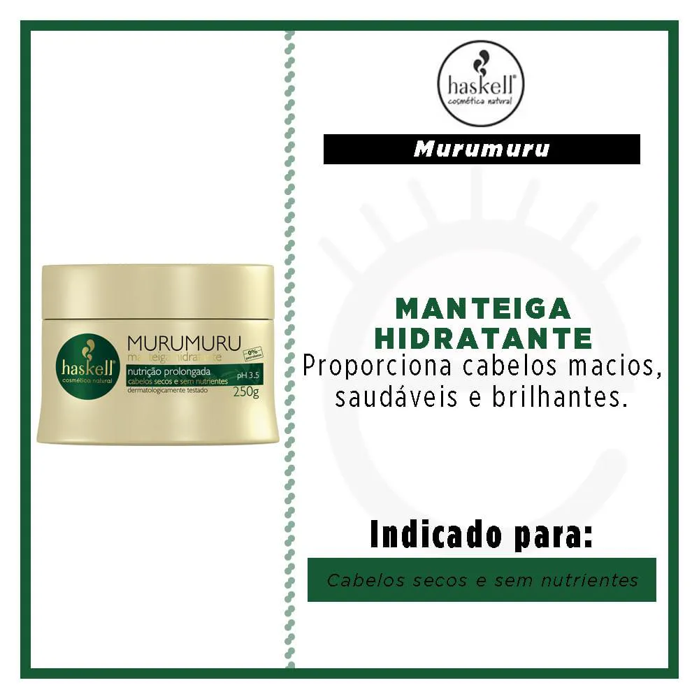A Manteiga hidratante Murumuru Haskell tem fórmula potente e ação nutritiva. O tempo de ação do produto é de apenas 3 minutos. Ele age condicionando e devolvendo os nutrientes essenciais, que deixam os fios saudáveis e brilhantes.