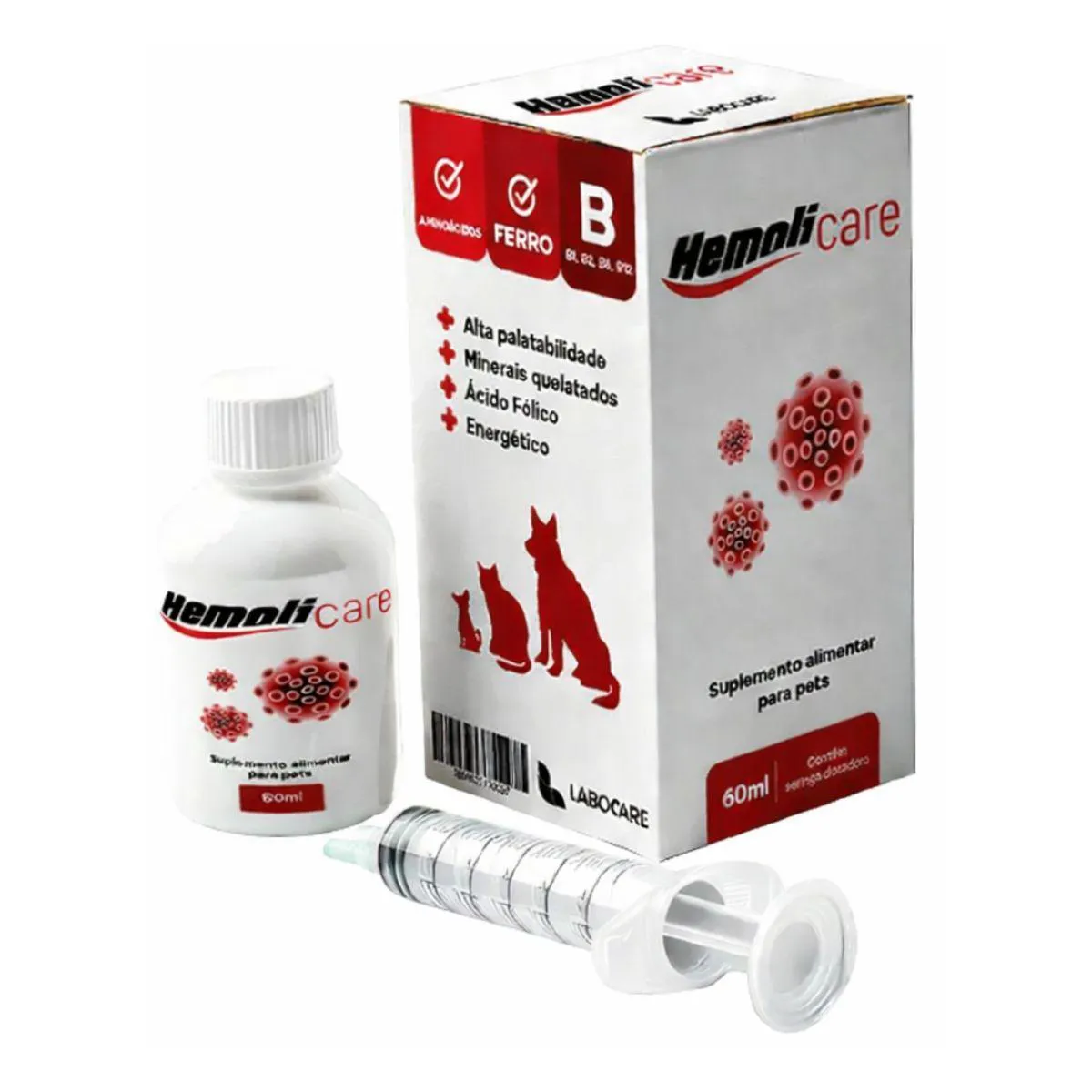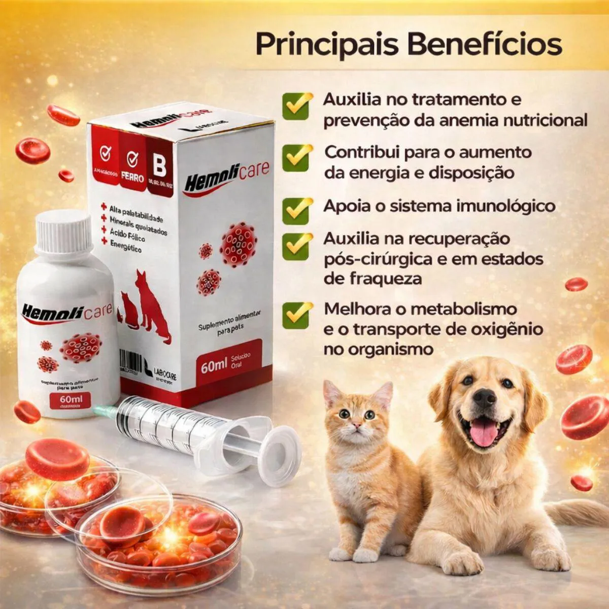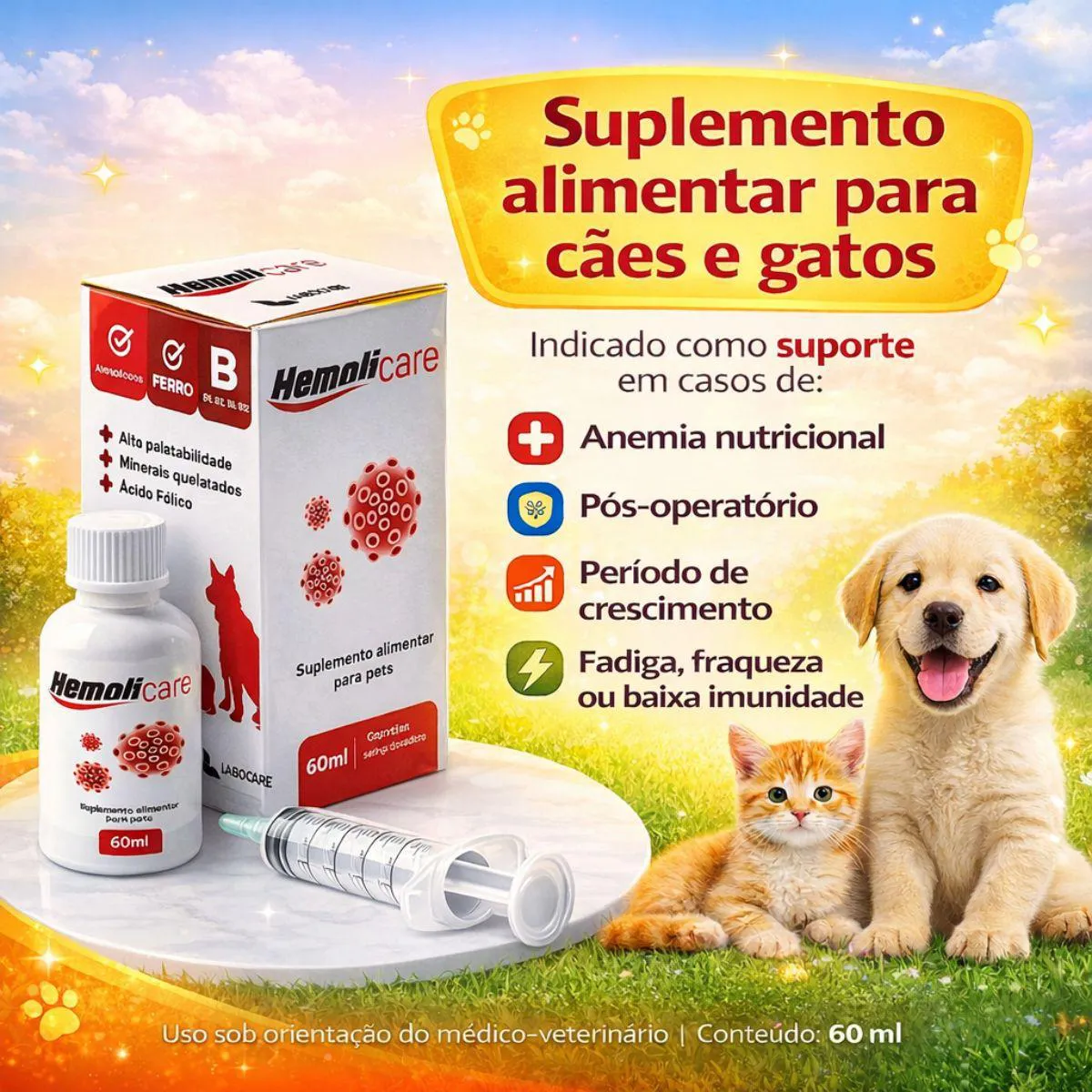 Hemolicare – Mais Energia, saúde e Bem-Estar para o seu Pet Hemolicare é um suplemento alimentar desenvolvido para apoiar a saúde hematológica de cães e gatos, especialmente em casos de anemia, fraqueza, pós-operatório e deficiências nutricionais. Sua fórmula completa, rica em ferro, aminoácidos, ácido fólico e vitaminas do complexo B, auxilia na formação dos glóbulos vermelhos, melhora a oxigenação do organismo e contribui para a recuperação da vitalidade e do bem-estar do pet. Alta palatabilidade