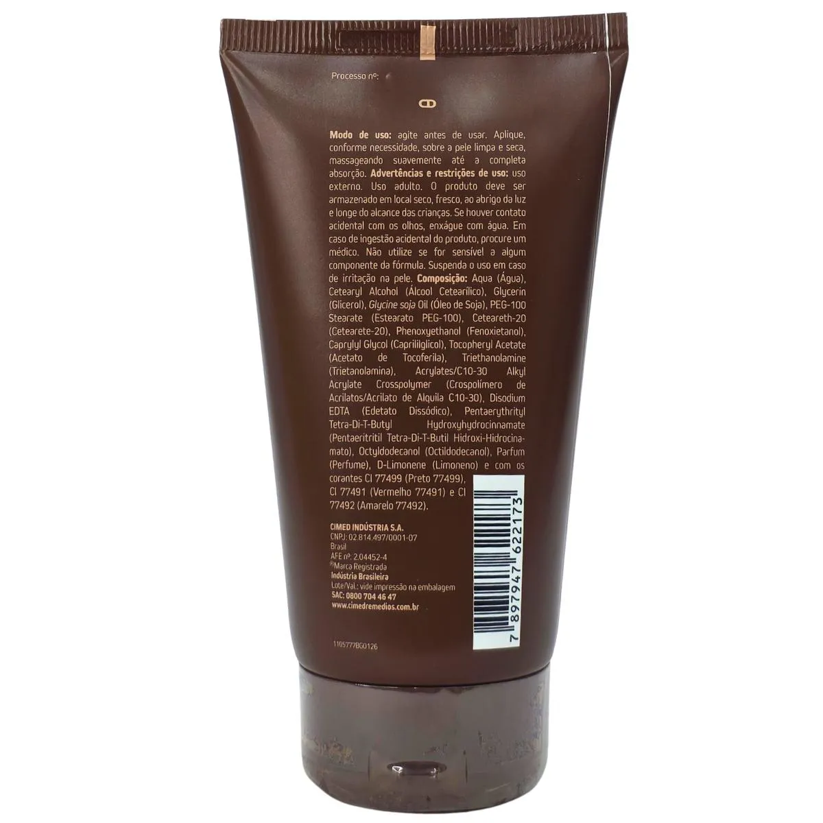 Composição: aqua (água), cetearyl alcohol (álcool cetoestearílico), glycerin (glicerina), glycine soja oil (óleo de soja), peg-100 stearate (estearato peg-100), ceteareth-20 (ceteareth-20), phenoxyethanol (fenoxietanol), caprylyl glycol (caprililglicol), tocopheryl acetate (acetato de tocoferila), triethanolamine (trietanolamina), acrylates/C10-30), disodium EDTA (edetato dissódico), pentaerythrityl tetra-di-t-butil hidroxi-hidrocinamato), octyldodecanol (octildodecanol), parfum (perfume), D-limonene (limoneno) e com os corantes CI77499 (preto 77499), CI77491 (vermelho 77491) e CI77492 (amarelo 77492).