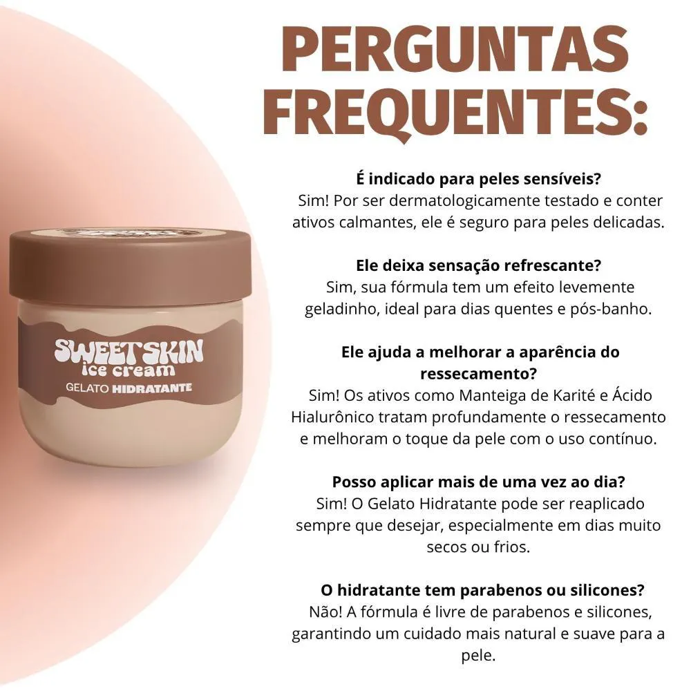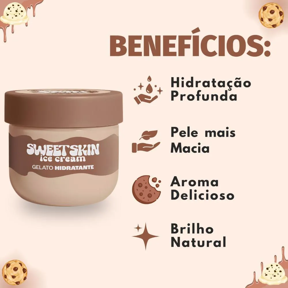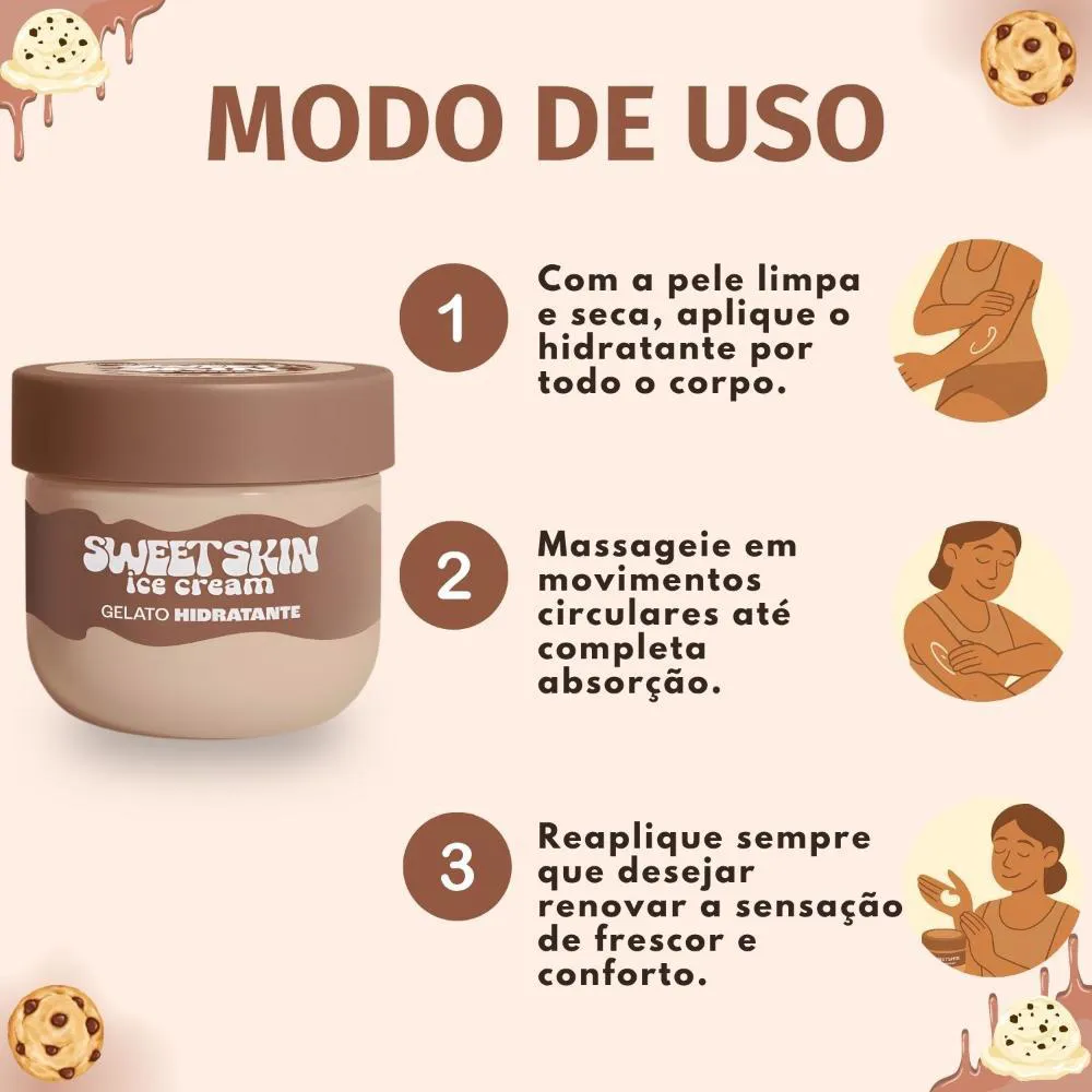 O Hidratante Corporal Gelato Sweet Skin Ice Cream Cookies e Cream é perfeito para o uso diário, seja após o banho para selar a hidratação e prolongar a sensação de frescor, antes de dormir para um momento relaxante e um sono tranquilo, ou a qualquer hora do dia para revitalizar a pele e desfrutar de sua fragrância envolvente. Ideal para presentear em datas especiais, como aniversários e Dia das Mães, ou para se dar um mimo em qualquer ocasião.Modo de Uso/Aplicação