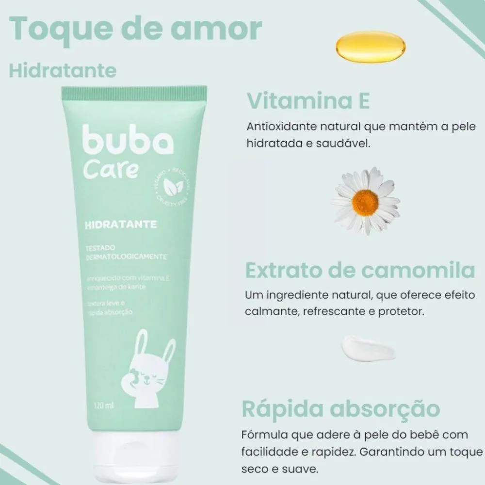 Um toque de carinho e cuidado para a pele do seu bebe O hidratante Corporal Buba Care foi feito para cuidar da pele delicada do bebe com todo o amor. Sua formula 100% vegana e enriquecida com vitamina e, manteiga de karite, camomila e glicerina, proporcionando hidratacao profunda e perfume suave. Com textura leve e de rapida absorcao, deixa a pele macia, saudavel e relaxada. Dermatologicamente testado, sem parabenos e cruelty free, e carinho em cada detalhe. Marca: Buba Linha: Buba Care Modelo: 16560 Idade recomendada: a partir do nascimento (0m+) Conteudo: 1 Hidratante 120ml Formula: Vegana, cruelty free, sem parabenos, sulfatos e corantes Composicao principal: Vitamina E, manteiga de karite, extrato de camomila e glicerina Dermatologicamente testado: Sim Garantia: 3 meses do fabricante