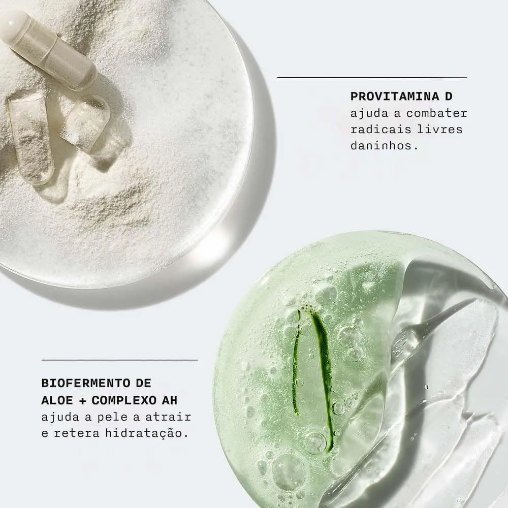 Bio-Fermento de Aloe Vera: feito de lactobacilos, água de aloe ativada e extrato de aloe em pó orgânico certificado e de origem responsável, este ingrediente exclusivo rico em nutrientes ajuda a pele a reter a umidade, além de ajudar a aumentar a elasticidade da pele para uma aparência mais lisa e saudável.