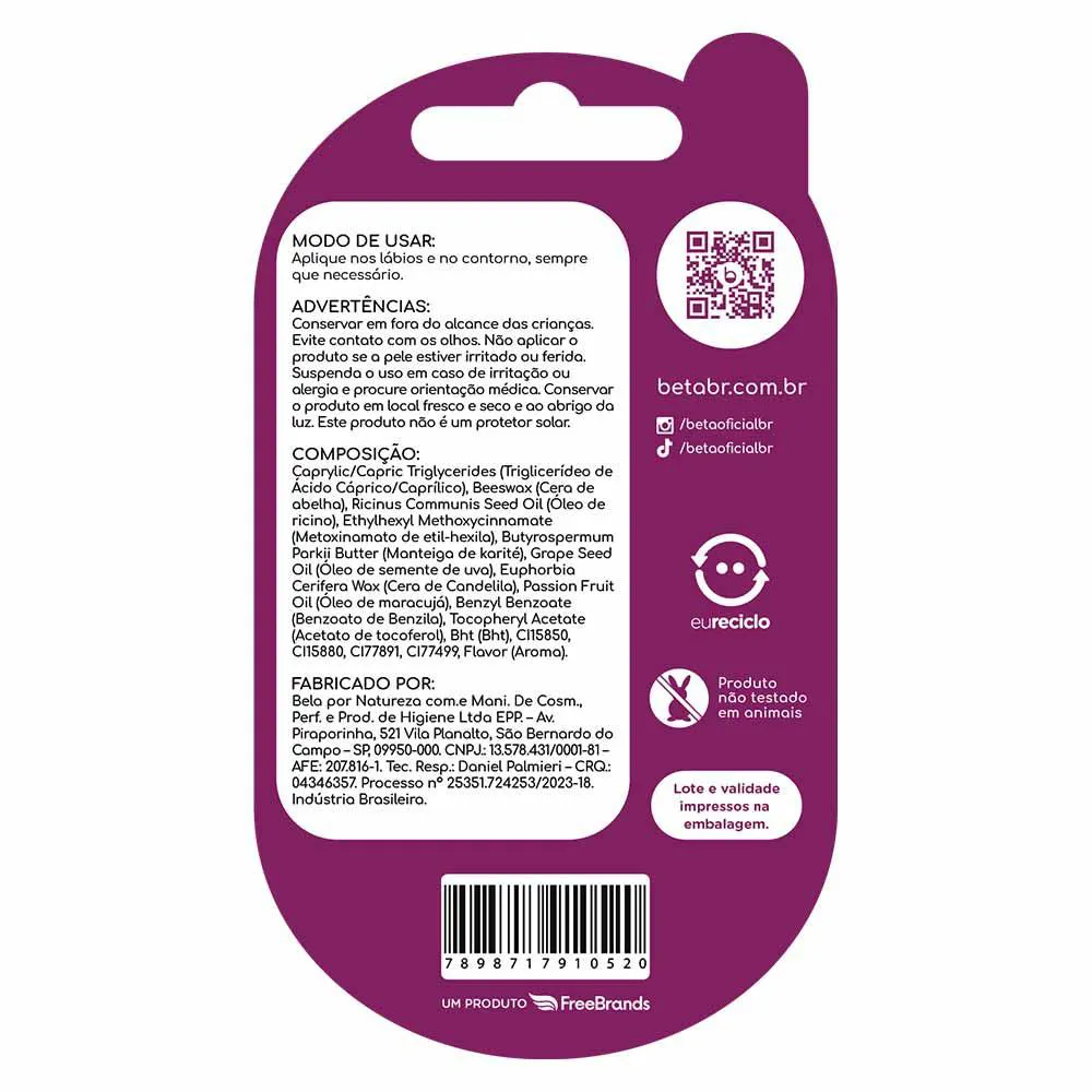 - Hidratação Prolongada: Composto por óleos naturais e manteiga de Karité, o Hidratante Labial Beta proporciona uma hidratação intensa e prolongada, garantindo lábios macios durante todo o dia.
