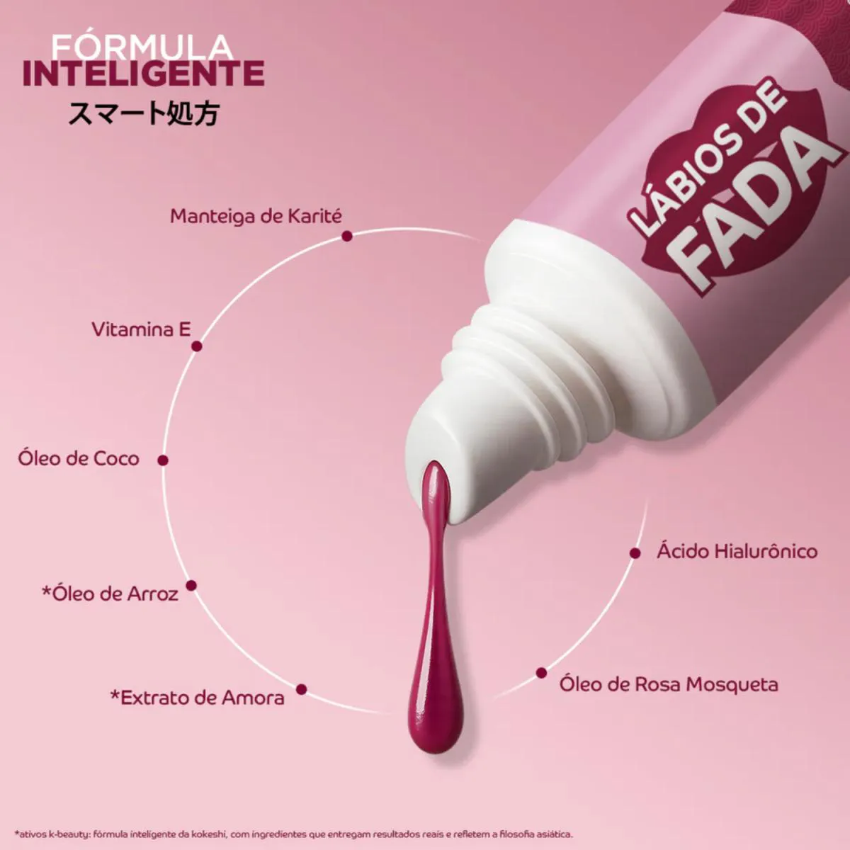 O Hidratante Lábios de Fada Kokeshi hidrata e nutre profundamente, deixando os lábios macios, com acabamento delicado e um sabor adocicado irresistível. Sua fórmula une manteiga de karité, vitamina e e óleos de arroz, coco e rosa mosqueta, em uma textura super confortável.