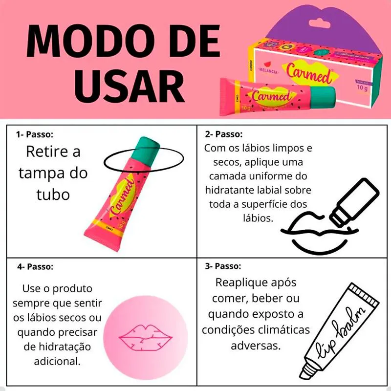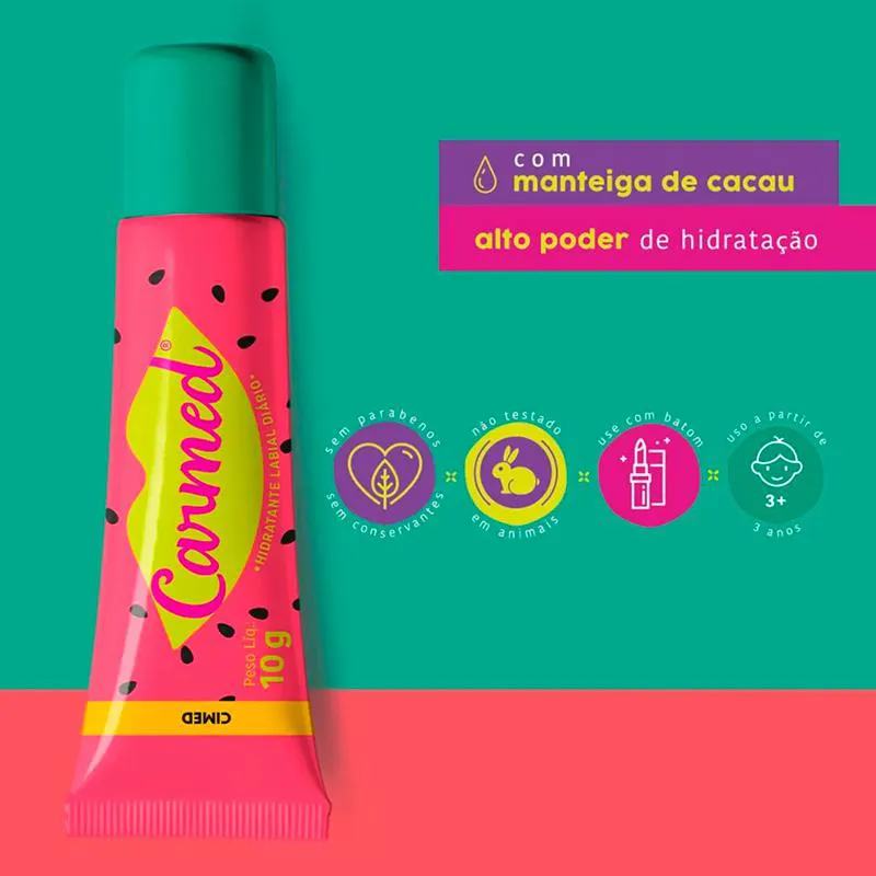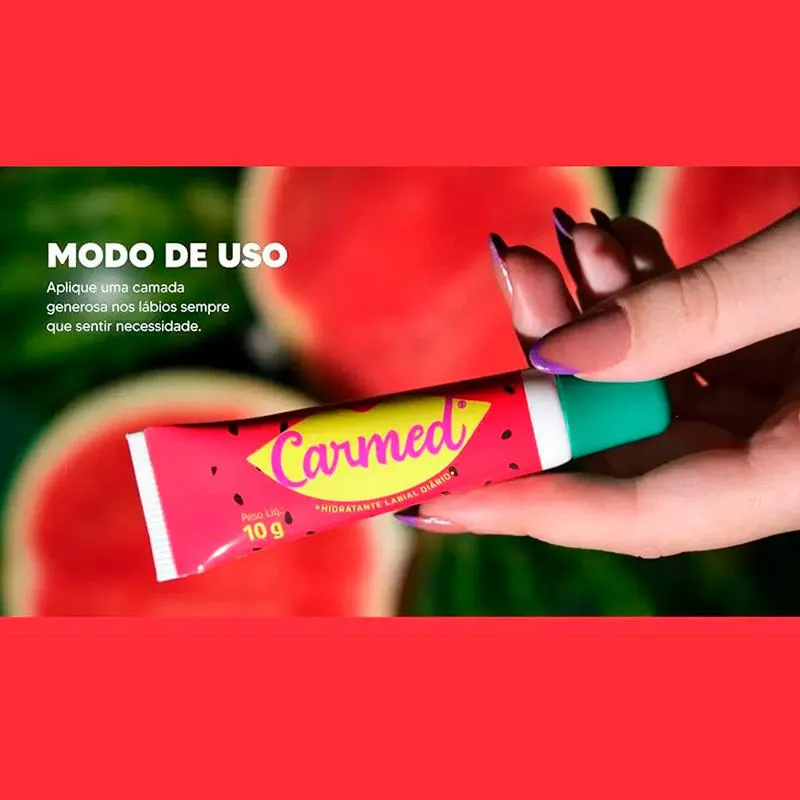 O Carmed Melancia combina hidratação intensa com uma sensação refrescante e deliciosa. Sua fórmula exclusiva mantém os lábios macios, protegidos e livres do ressecamento, prevenindo rachaduras e proporcionando conforto ao longo do dia.