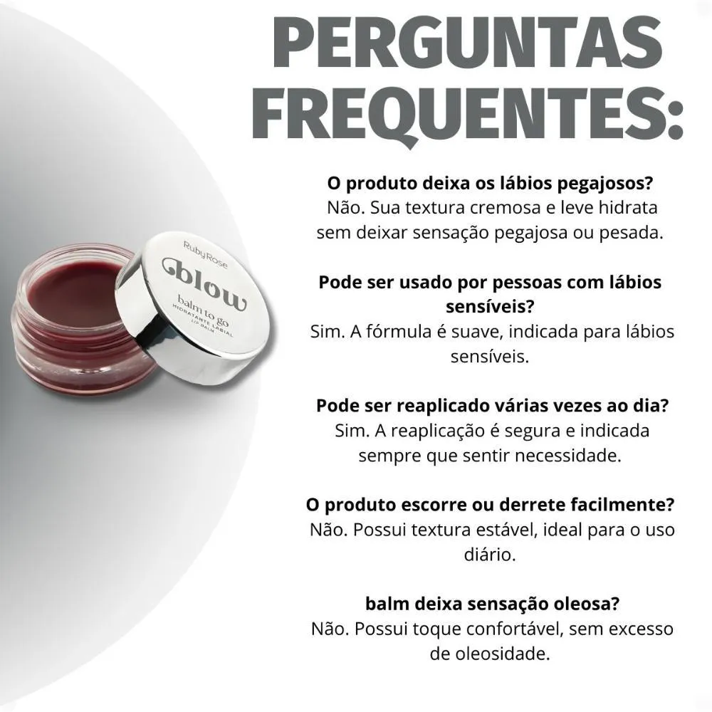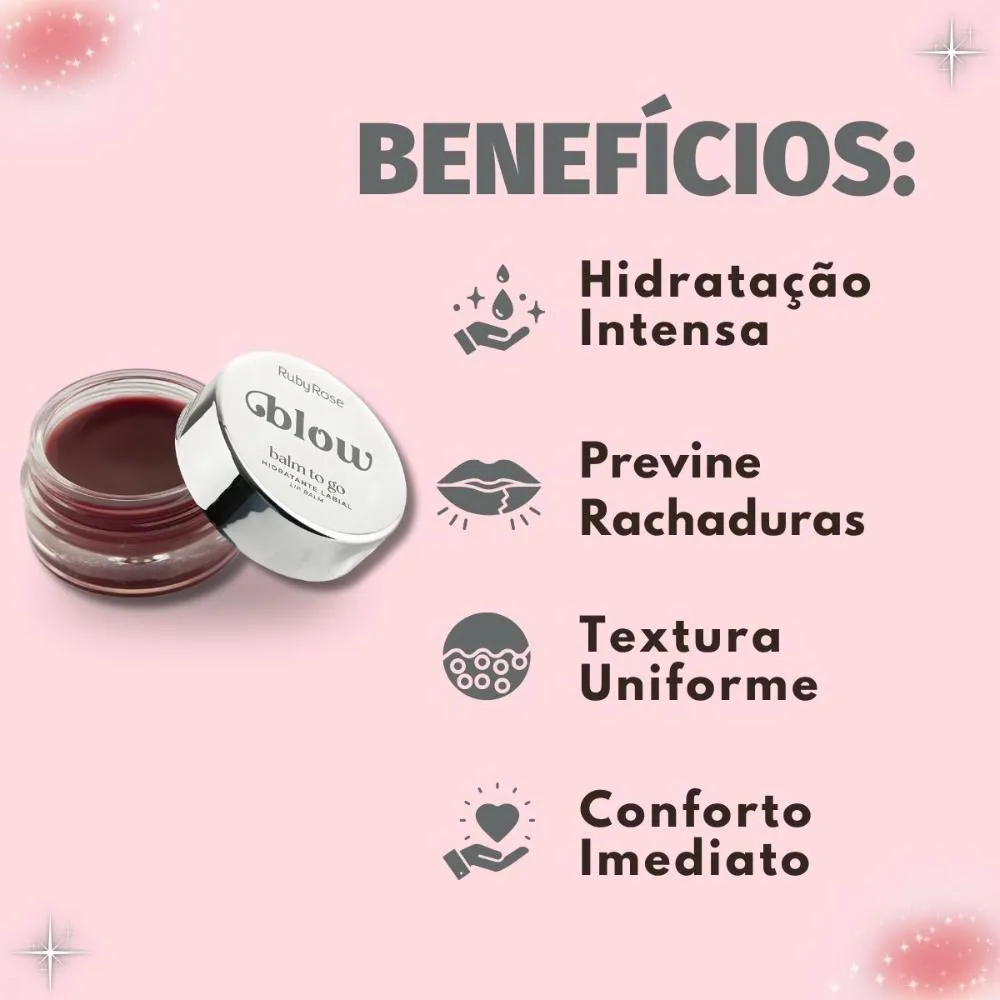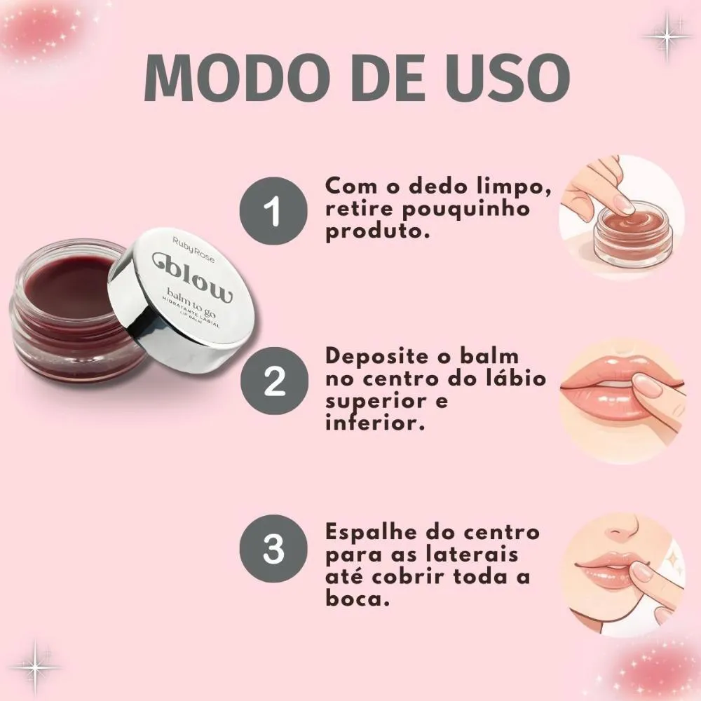 Para obter os melhores resultados, aplique o Hidratante Labial Ruby Rose Blow Balm To Go diretamente nos lábios sempre que sentir necessidade. Sua aplicação é simples e prática, garantindo um toque de hidratação e proteção imediata para o seu dia a dia.Anvisa: 25351.110720/2025-90