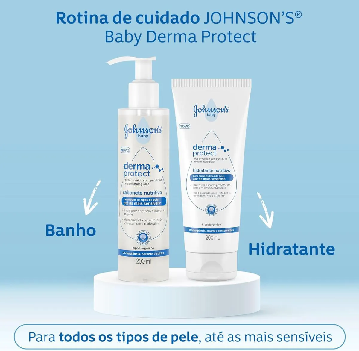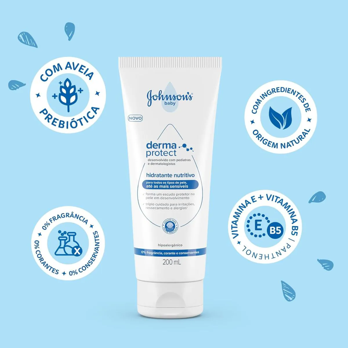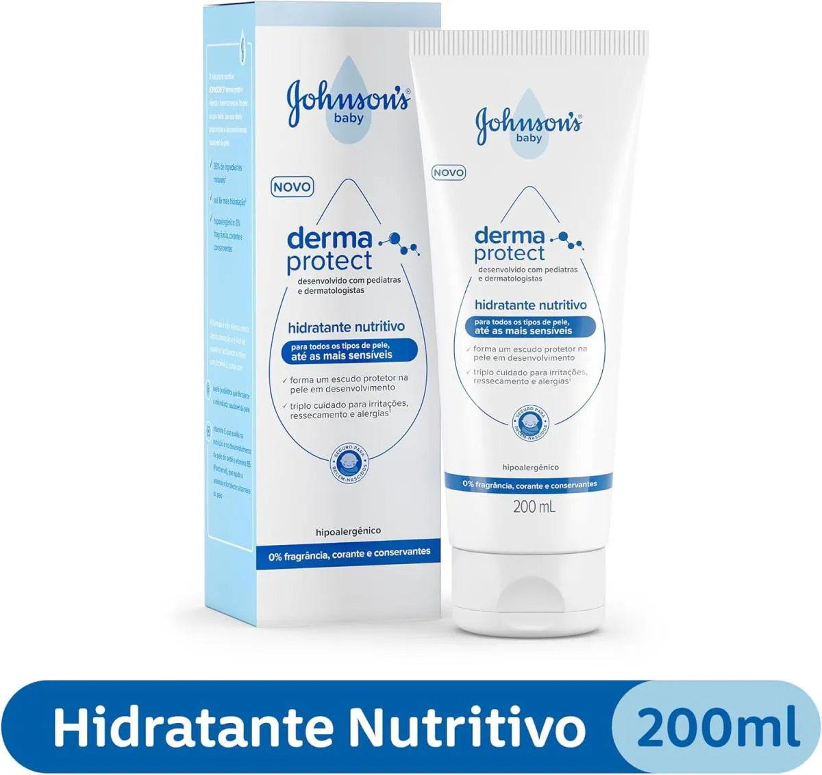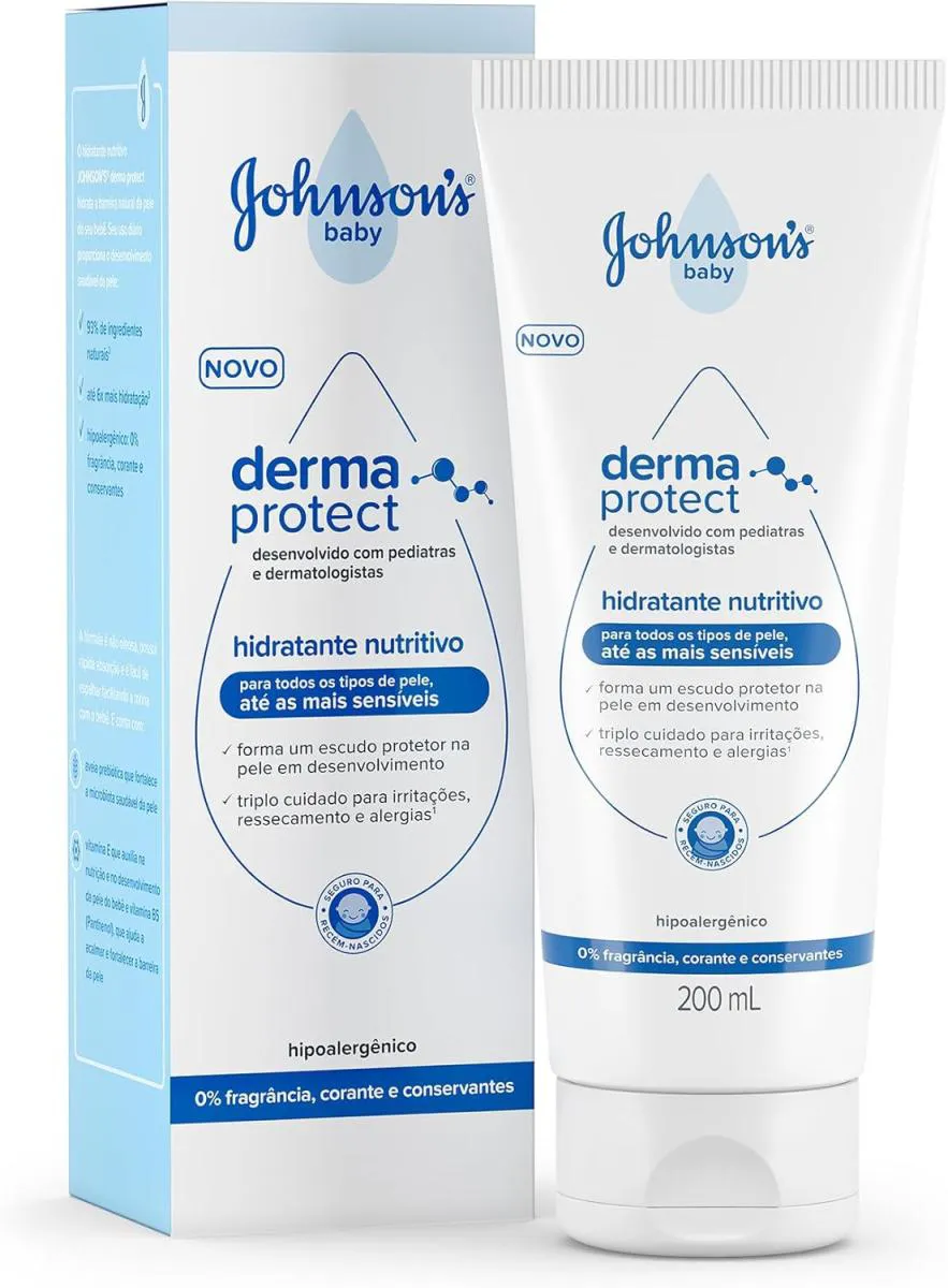 - O hidratante Nutritivo Johnson's Derma Protect forma um escudo protetor na pele em desenvolvimento com triplo cuidado para irritações, ressecamento e alergias.
