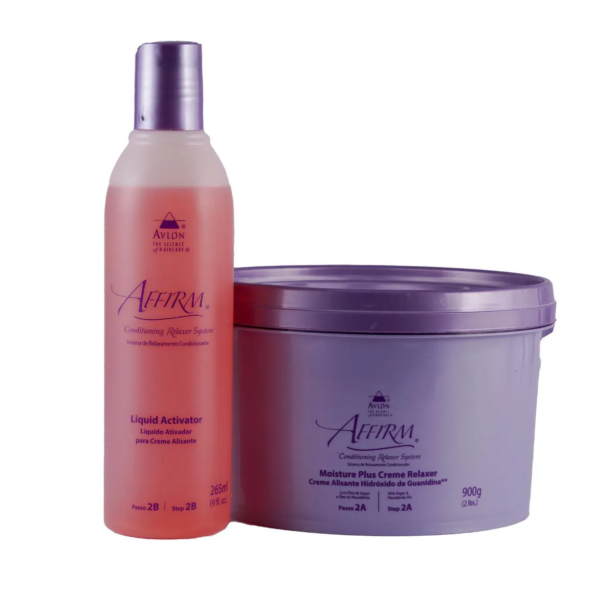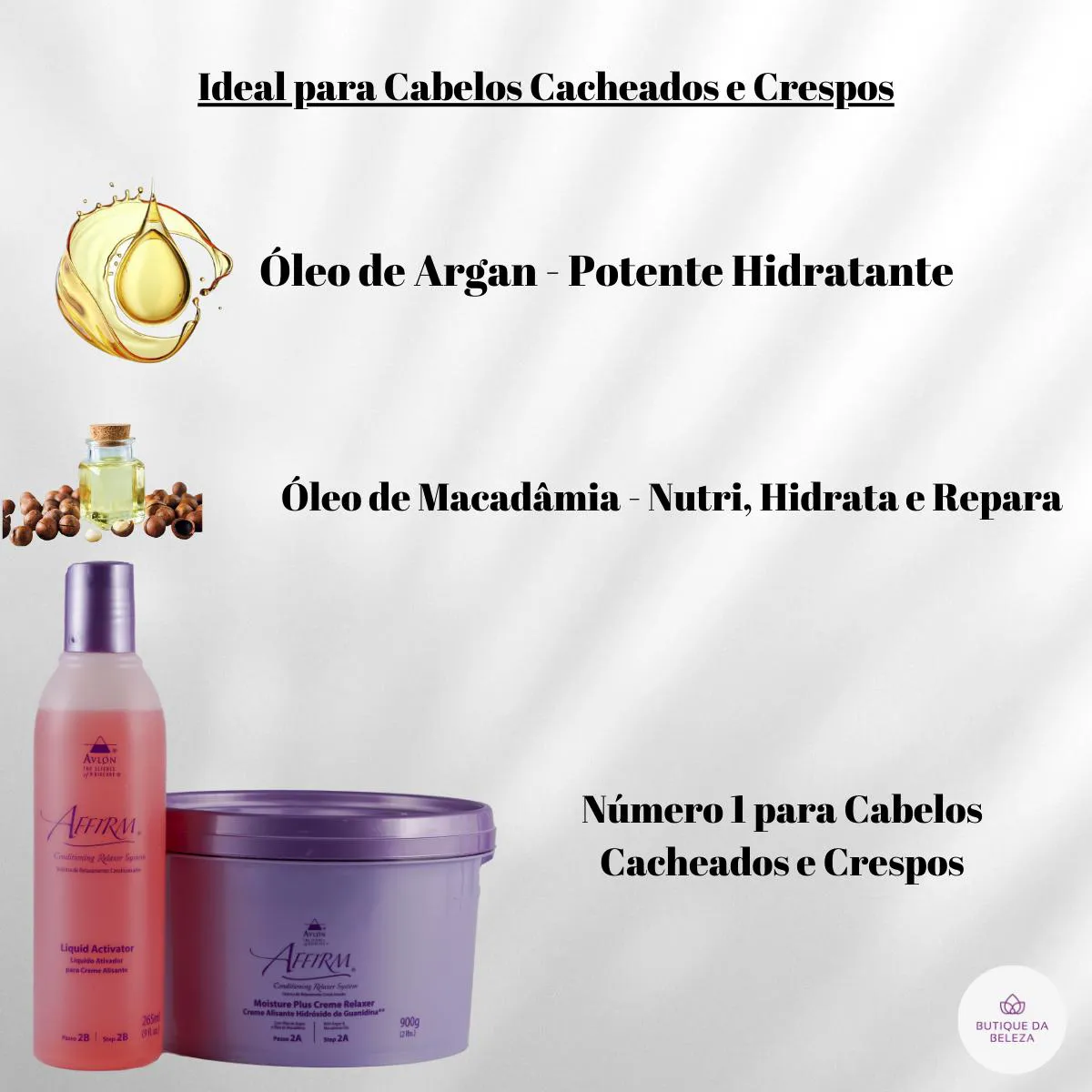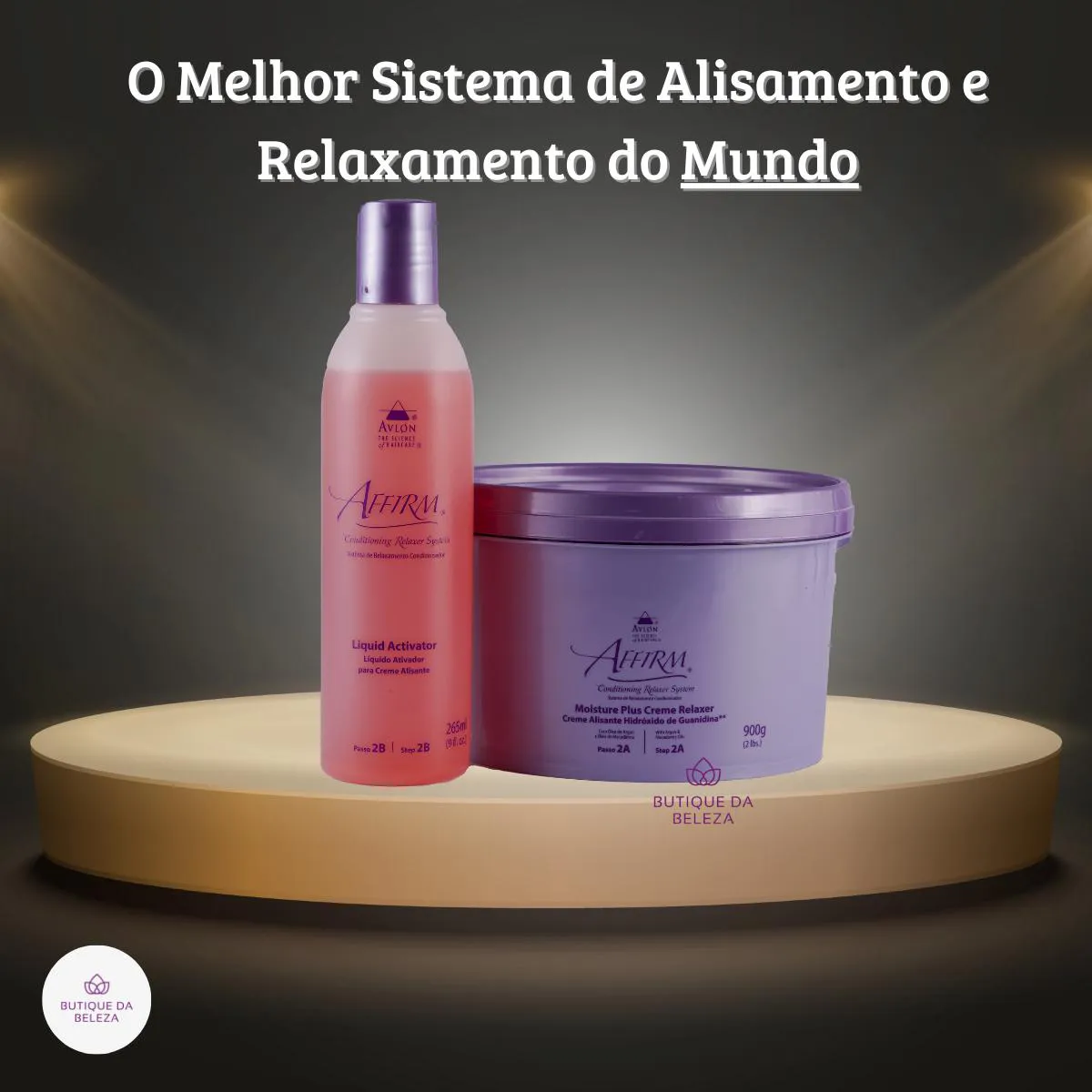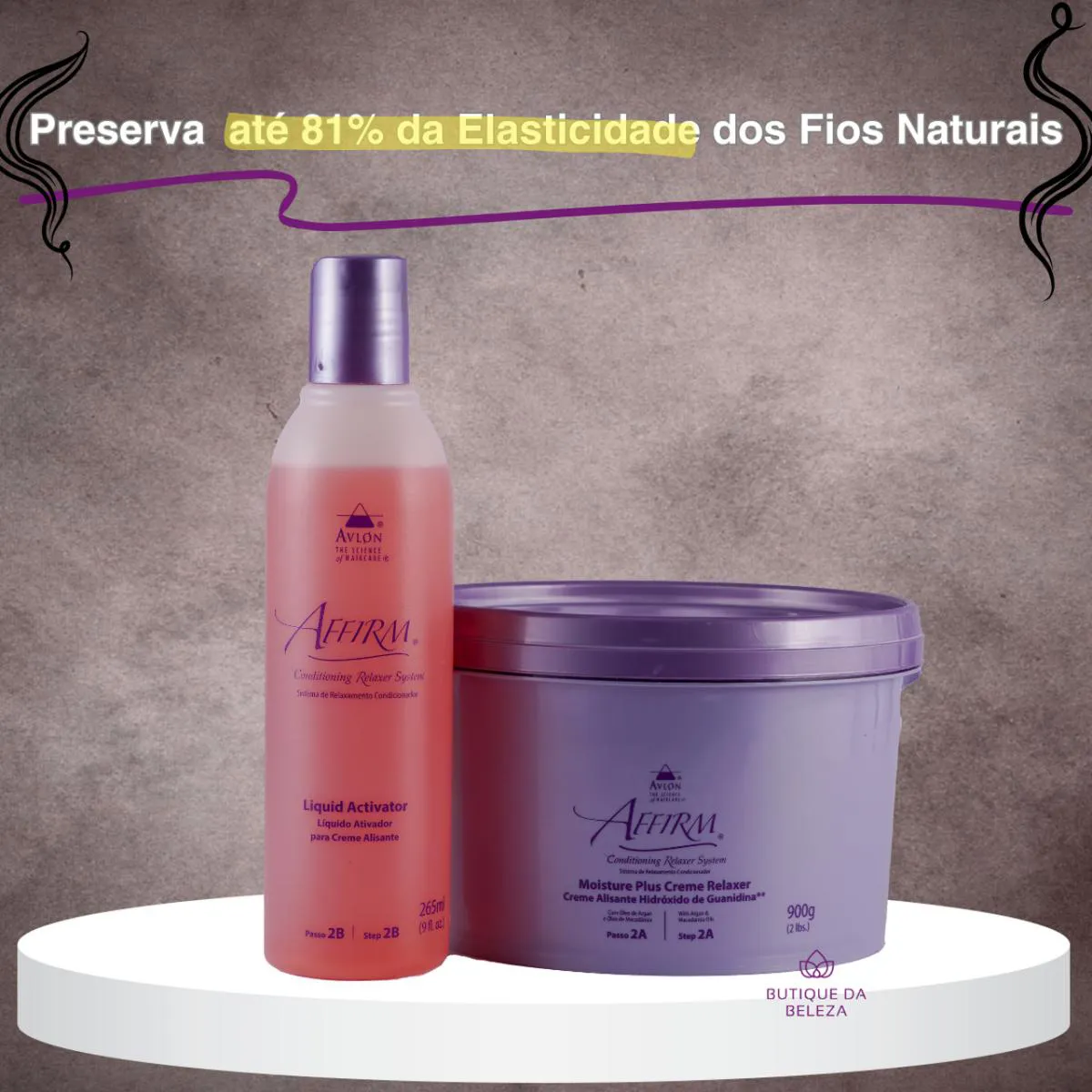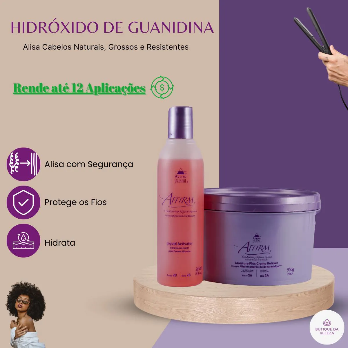 SERVIR E AJUDAR SÃO NOSSOS DEVERES ACOMPANHA O ATIVADOR DE GUANIDINA DE 265ml HIDRÓXIDO DE GUANIDINA AVLON AFFIRM Reconhecido mundialmente, a Avlon Affirm é o sistema de alisamento e relaxamento mais avançado, o Hidróxido de Guanidina Affirm, da Avlon oferece resultados incomparáveis para cabelos cacheados e crespos (tipos 3 e 4). Desenvolvido com a expertise líder em cuidados capilares, sua fórmula combina alta tecnologia com ativos nutritivos como óleo de argan e macadâmia, garantindo alisamento duradouro e preservação de até 81% da elasticidade natural dos fios, um feito exclusivo no mercado de relaxamento capilar. Portanto, se você busca um relaxamento e, ou alisamento eficaz para cabelos cacheados e crespos (tipos 3 e 4),a Linha Avlon Affirm é a solução perfeita. INDICADO PARA QUAL TIPO DE cabelo Cabelos resistentes e volumosos, cacheados ou crespos, que necessitam de relaxamento ou alisamento duradouro e saudável. BENEFÍCIOS Alisamento Uniforme: Resultados duradouros e cabelos sem frizz. Preservação dos Fios: Mantém a elasticidade natural dos cabelos. Nutrição e Condicionamento: Hidrata enquanto alisa graças aos óleos essenciais. Redução de Quebras: Cabelos mais resistentes e protegidos contra danos. RESULTADOS Cabelos visivelmente mais lisos, saudáveis e maleáveis, com brilho intenso e controle de volume prolongado. MODO DE USO Aplique conforme as instruções no livreto explicativo que acompanha o produto, e respeite as etapas de aplicação, medidas, bem como o tempo de pausa recomendado. IMPORTANTE: Sempre faça um teste de mechas antes de utilizar o produto, e ao menor sinal de reação alérgica, interrompa a aplicação imediatamente. DICA BUTIQUE DA BELEZA: Para um tratamento completo e duradouro, combine com outros produtos da linha Affirm para nutrição e manutenção pós-química. COMPOSIÇÃO (PORTUGUÊS):