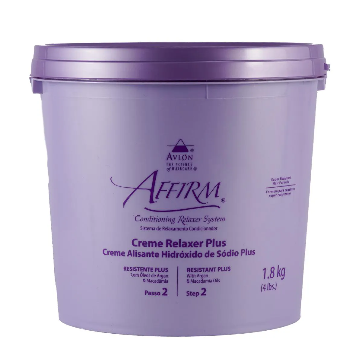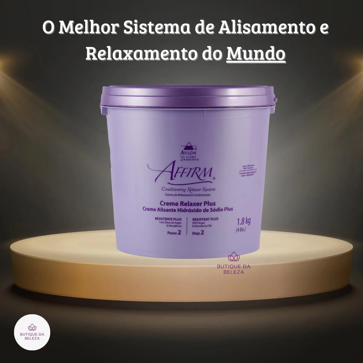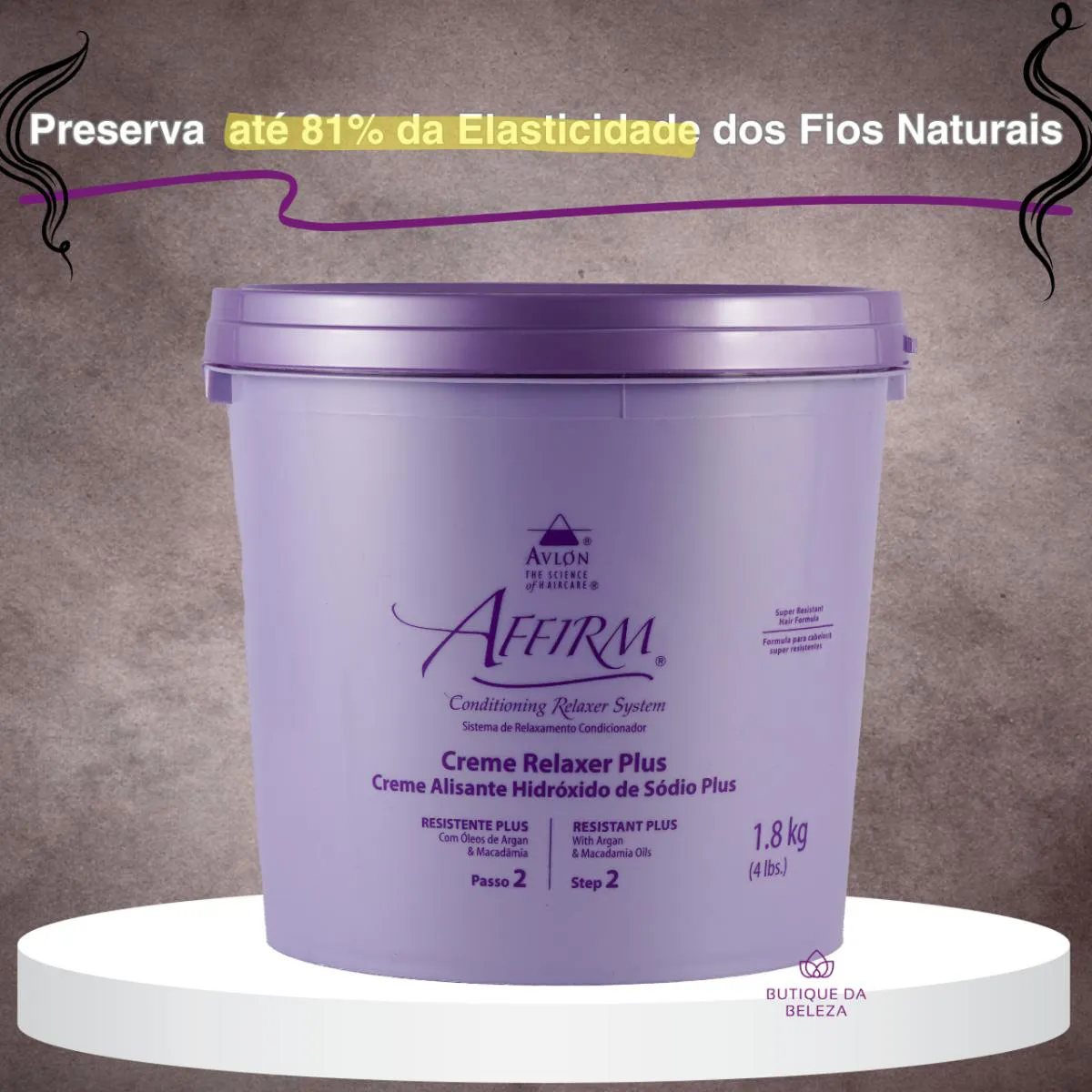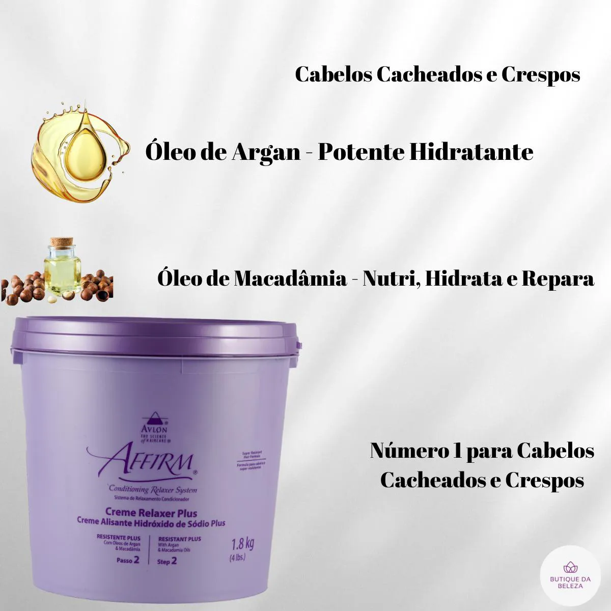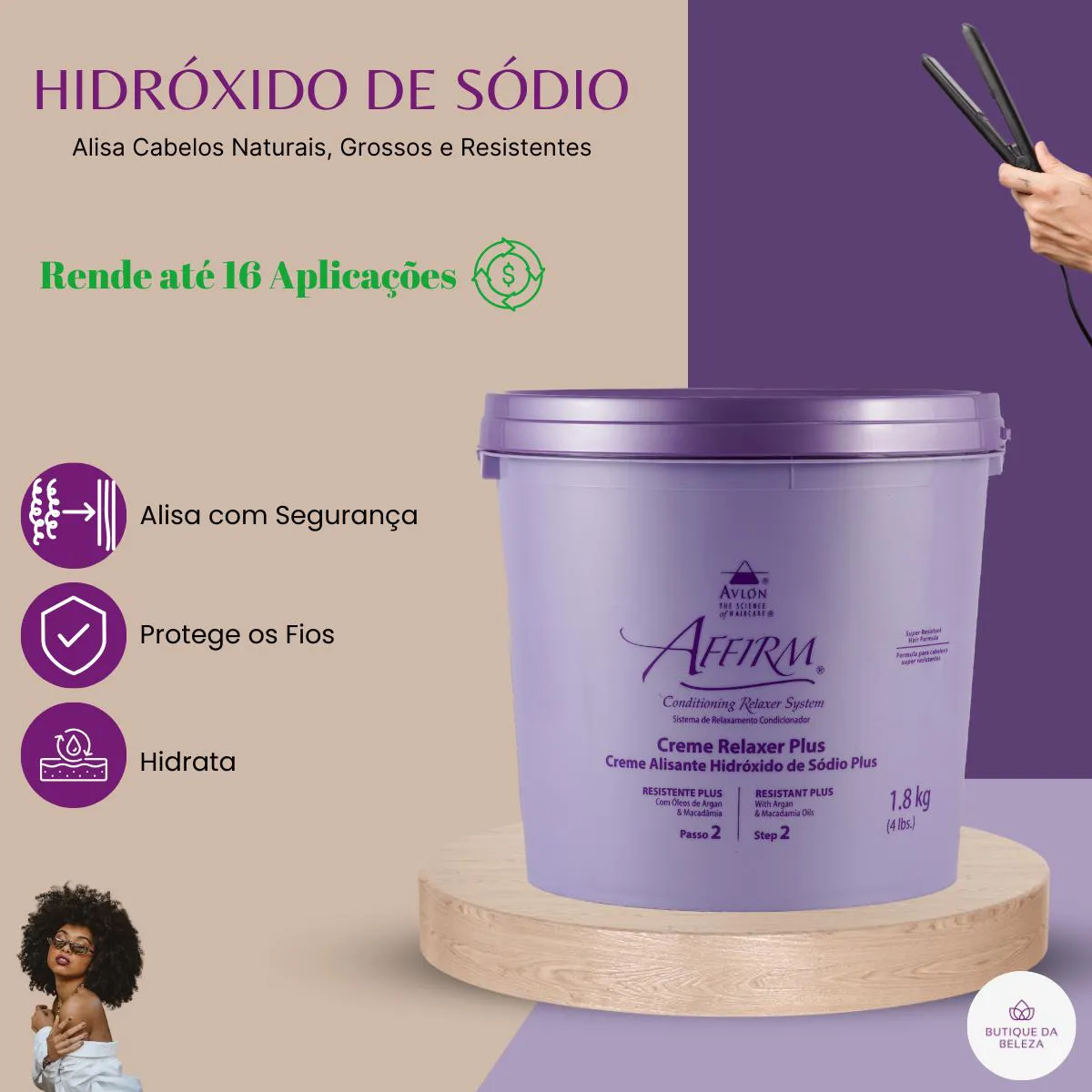 SERVIR E AJUDAR SÃO NOSSOS DEVERES HIDRÓXIDO DE SÓDIO AVLON AFFIRM RESISTANT PLUS Reconhecido mundialmente, a Avlon Affirm é o sistema de alisamento e relaxamento mais avançado, o Hidróxido de Sódio Affirm oferece resultados incomparáveis para cabelos cacheados e crespos (tipos 3 e 4). Desenvolvido com a expertise líder em cuidados capilares, sua fórmula combina alta tecnologia com ativos nutritivos como óleo de argan e macadâmia, garantindo alisamento duradouro e preservação de até 81% da elasticidade natural dos fios, um feito exclusivo no mercado de relaxamento capilar. Portanto, se você busca um relaxamento e, ou alisamento eficaz para cabelos cacheados e crespos (tipos 3 e 4),a Linha Avlon Affirm é a solução perfeita. INDICADO PARA QUAL TIPO DE cabelo Cabelos resistentes e volumosos, cacheados ou crespos, que necessitam de relaxamento ou alisamento duradouro e saudável. BENEFÍCIOS Alisamento Uniforme: Resultados duradouros e cabelos sem frizz. Preservação dos Fios: Mantém a elasticidade natural dos cabelos. Nutrição e Condicionamento: Hidrata enquanto alisa graças aos óleos essenciais. Redução de Quebras: Cabelos mais resistentes e protegidos contra danos. RESULTADOS Cabelos visivelmente mais lisos, saudáveis e maleáveis, com brilho intenso e controle de volume prolongado. MODO DE USO Aplique conforme as instruções no livreto explicativo que acompanha o produto, e respeite as etapas de aplicação e o tempo de pausa recomendado. IMPORTANTE: Sempre faça um teste de mechas antes de utilizar o produto, e ao menor sinal de reação alérgica, interrompa a aplicação imediatamente. DICA BUTIQUE DA BELEZA: Para um tratamento completo e duradouro, combine com outros produtos da linha Affirm para nutrição e manutenção pós-química. COMPOSIÇÃO (PORTUGUÊS):