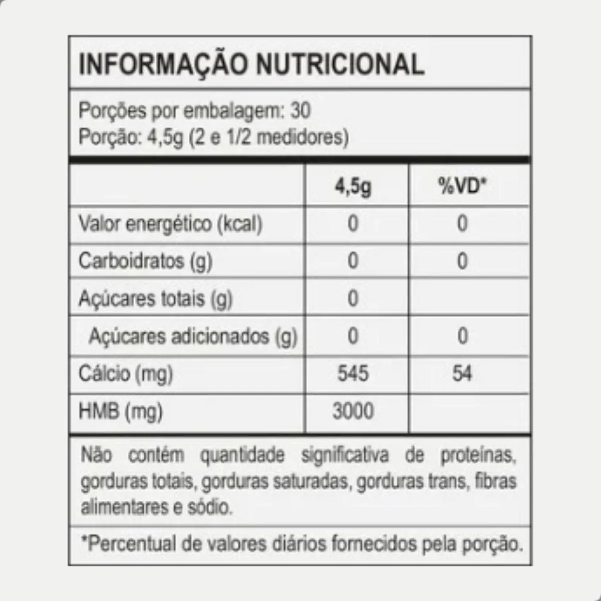 Sua composição HMB cálcico de alta pureza em pó sem sabor; livre de açúcar, glúten ou lactose. e não inclui componentes de origem animal ou alergênicos comuns, adaptando-se a diferentes estilos de vida.