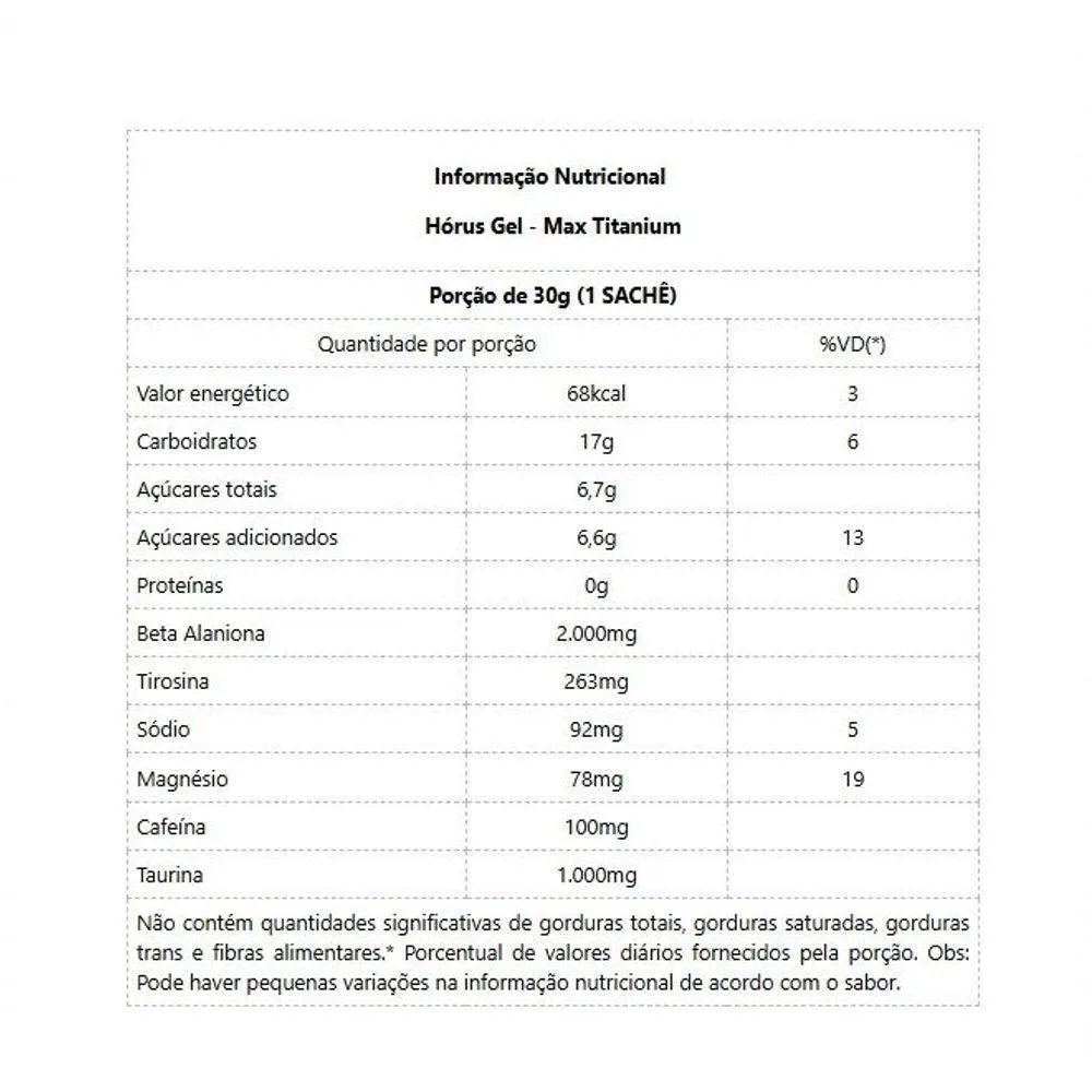 Hórus Gel Sachê (30g) O pré-treino líder de mercado agora em uma versão que te auxilia na conveniência de consumo, sinta o poder de Hórus agora na versão Gel! Destinado para quem se exercita com intensidade, desenvolvemos o HÓRUS GEL: com formulação altamente tecnológica e ingredientes de altíssima qualidade, para te auxiliar na sua rotina de treinos. HÓRUS GEL contém tirosina, beta-alanina, taurina, cafeína que auxilia aumento do estado de alerta e na melhora da concentração e magnésio que auxilia no metabolismo energético e no funcionamento muscular. Benefícios: - 2g de Beta alanina;- 100mg de Cafeína;- 1.000mg de Taurina;- 263mg de L-Tirosina;- 78mg de Magnésio;- Resistência;- Desempenho;- Rápida absorção;- A cafeína auxilia no aumento do estado de alerta e na melhora da concentração.