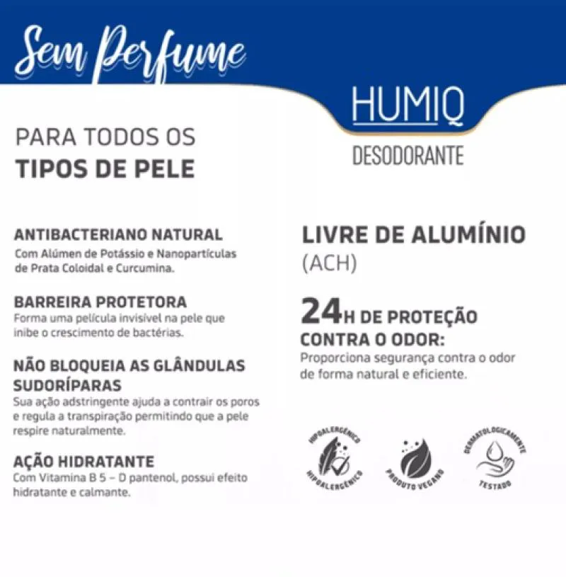 Embora não seja antitranspirante, oferece uma proteção eficaz contra odores, permitindo que sua pele respire livremente. Além disso, não causa manchas nas roupas, proporcionando tranquilidade na hora de se vestir. Com o Humiq Sem Perfume, você poderá desfrutar de uma experiência única, combinando cuidado pessoal com a essência refrescante da natureza.