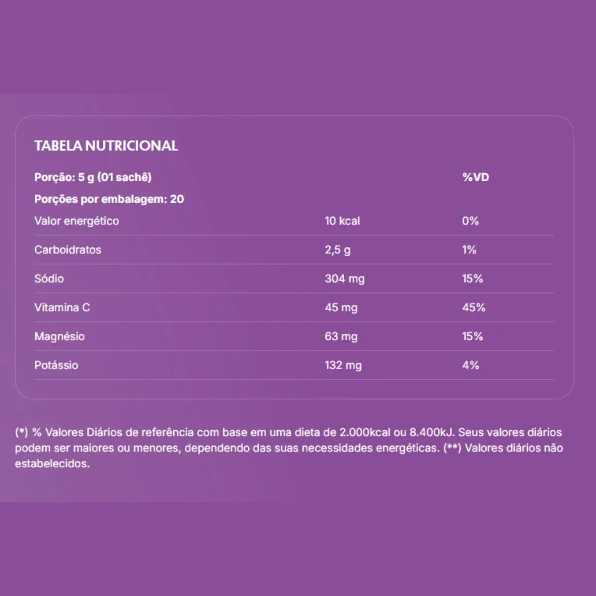 O Hydration Electrolytes é um repositor inteligente de eletrólitos, desenvolvido para toda a família e todos os estilos de vida. Com uma fórmula inovadora, combina água de coco orgânica em pó, sódio, potássio e magnésio bisglicinato para garantir hidratação eficiente, reposição mineral, energia e bem-estar. Com baixo teor de carboidratos, baixa caloria, zero açúcar, zero glúten e ingredientes naturais, é perfeito para quem busca saúde, desempenho e refrescância sem excessos. Sua ação antioxidante é reforçada por vitamina c e frutas desidratadas, ajudando a combater radicais livres e fortalecer o sistema imune. Ingredientes:Água de coco orgânica em pó, cloreto de sódio, cloreto de potássio, bisglicinato de magnésio, melão em pó, jabuticaba em pó, vitamina C (ácido ascórbico), acidulante ácido cítrico, regulador de acidez citrato trissódico, aroma natural de jabuticaba, antiumectante dióxido de silício e edulcorante glicosídeos de esteviol de stevia rebaudiana bertoni. NÃO CONTÉM GLÚTEN. Como usar: Diluir 01 sachê (5 g) em 300 ml a 500 ml de água gelada. Mexer até completa dissolução. Para um sabor mais concentrado e doce dilua em menos água.