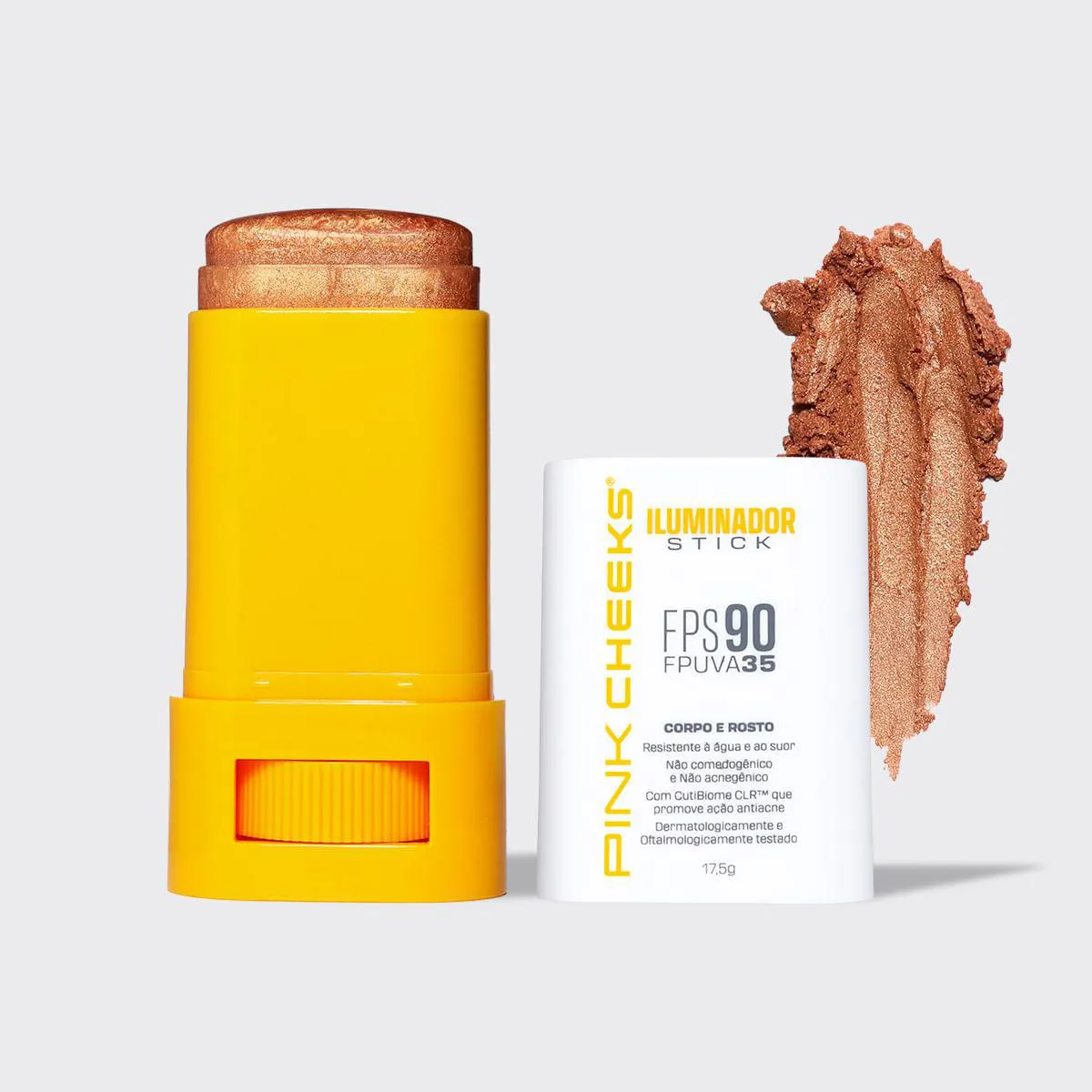 Nos seus sonhos, você imaginou um único produto com infinitas possibilidades, proteção de alta performance e brilho surpreendente, que realça a sua pele como um passe de mágica. A PINK CHEEKS atendeu esse desejo com o ILUMINADOR MULTIFUNCIONAL. Com partículas de brilho, realça suas características naturais. A cobertura é construível — ou seja, você adapta a intensidade como preferir. O toque é sequinho, sem sensação pegajosa ou oleosa. E, graças ao formato stick, a aplicação é simples. Tudo isso com proteção garantida: FPS 90 e FPUVA 35. Use onde e como quiser: para iluminar pontos específicos ou espalhar por todo o corpo. Como se pudéssemos superar suas expectativas — e podemos! — essa fórmula merece destaque. Nosso iluminador tudo-em-um é potencializado com CutiBiome CLR™, um ativo que reduz a inflamação da acne e controla a oleosidade. E para brilhar sem preocupações: também é resistente à água e ao suor. Fique à vontade para escolher o brilho que mais te chamar a atenção. Mas para facilitar a escolha, essas são as nossas indicações: se tons quentes realçam seus traços, você vai amar o Gold. Agora, se a cartela fria te favorece mais, experimente o Rosé ou o Champagne. Ainda, se sua pele é retinta, o Bronze foi desenvolvido pensando especialmente em você!