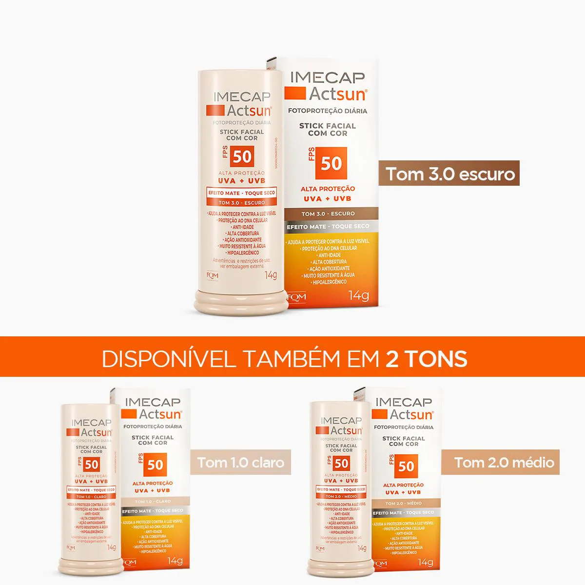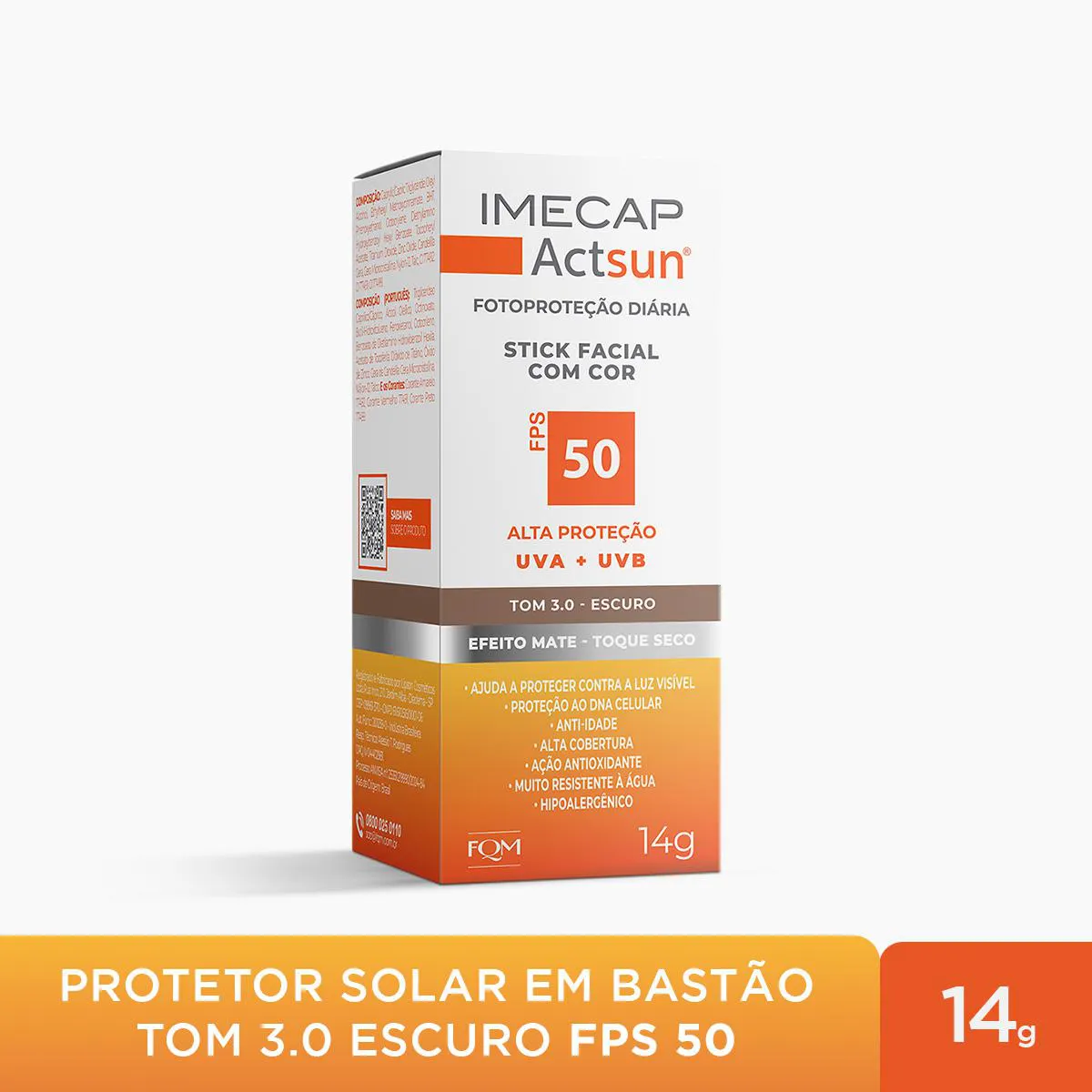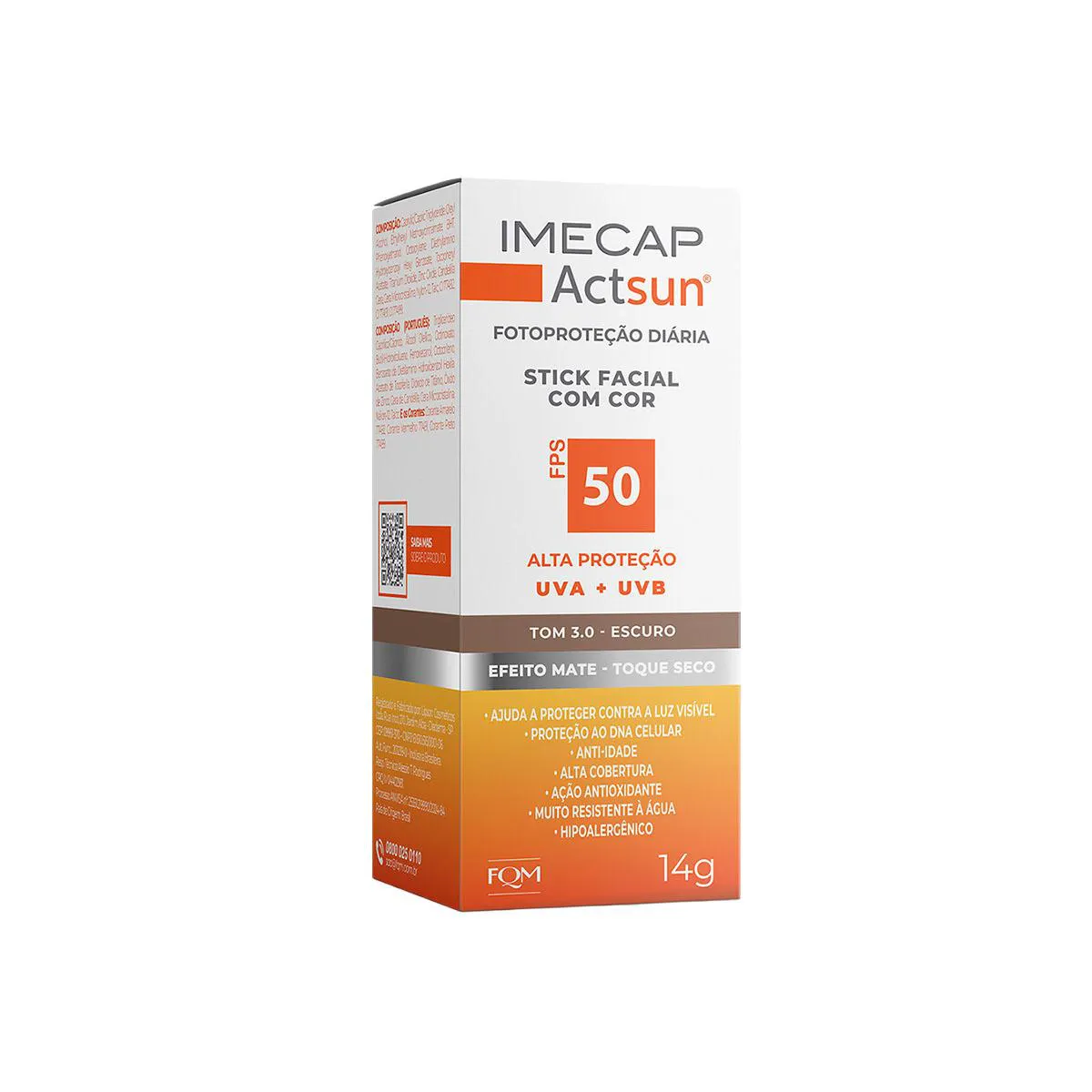 O Protetor Solar Facial Stick Imecap Actsun FPS 50 Escuro é um filtro solar de uso diário desenvolvido especialmente para o rosto. Com altíssima proteção UVA, UVB e UVA longo, sua fórmula inovadora protege a pele contra os efeitos imediatos e cumulativos do sol, além de defender contra radicais livres, luz visível, infravermelho e os danos causados pelo fotoenvelhecimento. Possui ação antioxidante, anti-idade e ajuda a prevenir manchas como melasmas, mantendo a pele saudável, protegida e com tom uniforme.