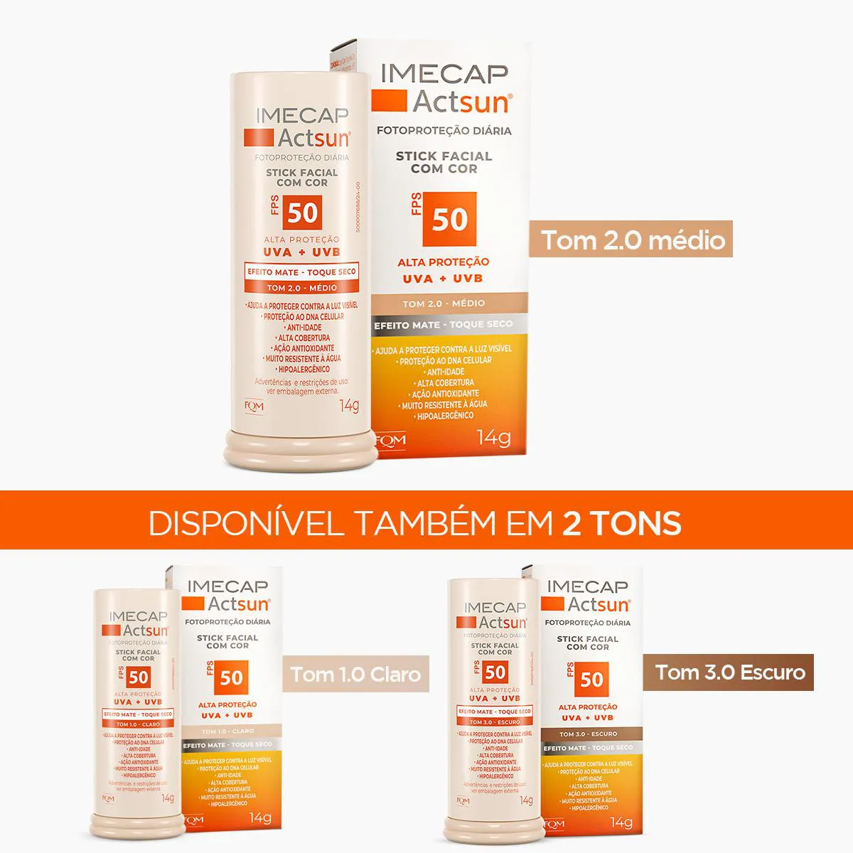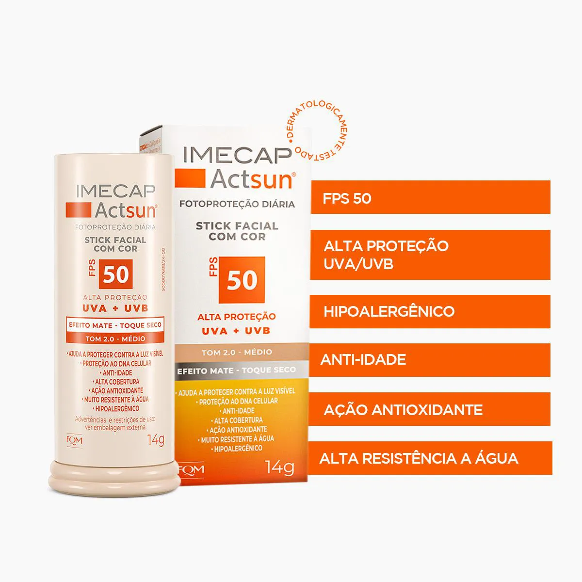 O Protetor Solar Facial Stick Imecap Actsun FPS 50 Médio é um filtro solar de uso diário desenvolvido especialmente para o rosto. Com altíssima proteção UVA, UVB e UVA longo, sua fórmula inovadora protege a pele contra os efeitos imediatos e cumulativos do sol, além de defender contra radicais livres, luz visível, infravermelho e os danos causados pelo fotoenvelhecimento. Possui ação antioxidante, anti-idade e ajuda a prevenir manchas como melasmas, mantendo a pele saudável, protegida e com tom uniforme.