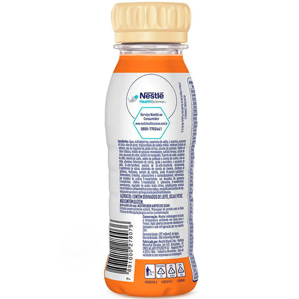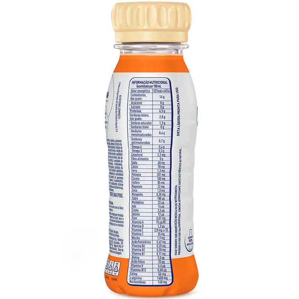 Água, maltodextrina, caseinato de sódio obtido do leite de vaca, óleo de peixe, L-arginina, caseinato de cálcio obtido do leite de vaca, triglicerídeos de cadeia média, óleo de milho, citrato de magnésio, cloreto de sódio, citrato de potássio, nucleotídeos, fosfato tricálcico, bitartarato de colina, vitamina c, fosfato de potássio, betacaroteno, vitamina e, sulfato de zinco, sulfato ferroso, niacinamida, vitamina a, pantotenato de cálcio, gluconato de cobre, sulfato de manganês, fluoreto de sódio, vitamina B1, vitamina B6, vitamina d, vitamina B2, vitamina K, cloreto de cromo, molibdato de sódio, ácido fólico, selenito de sódio, iodeto de potássio, biotina, vitamina B12, aromatizantes, regulador de acidez ácido cítrico, emulsificante lecitina de soja, edulcorante sucralose e antiespumante polidimetilsiloxano.