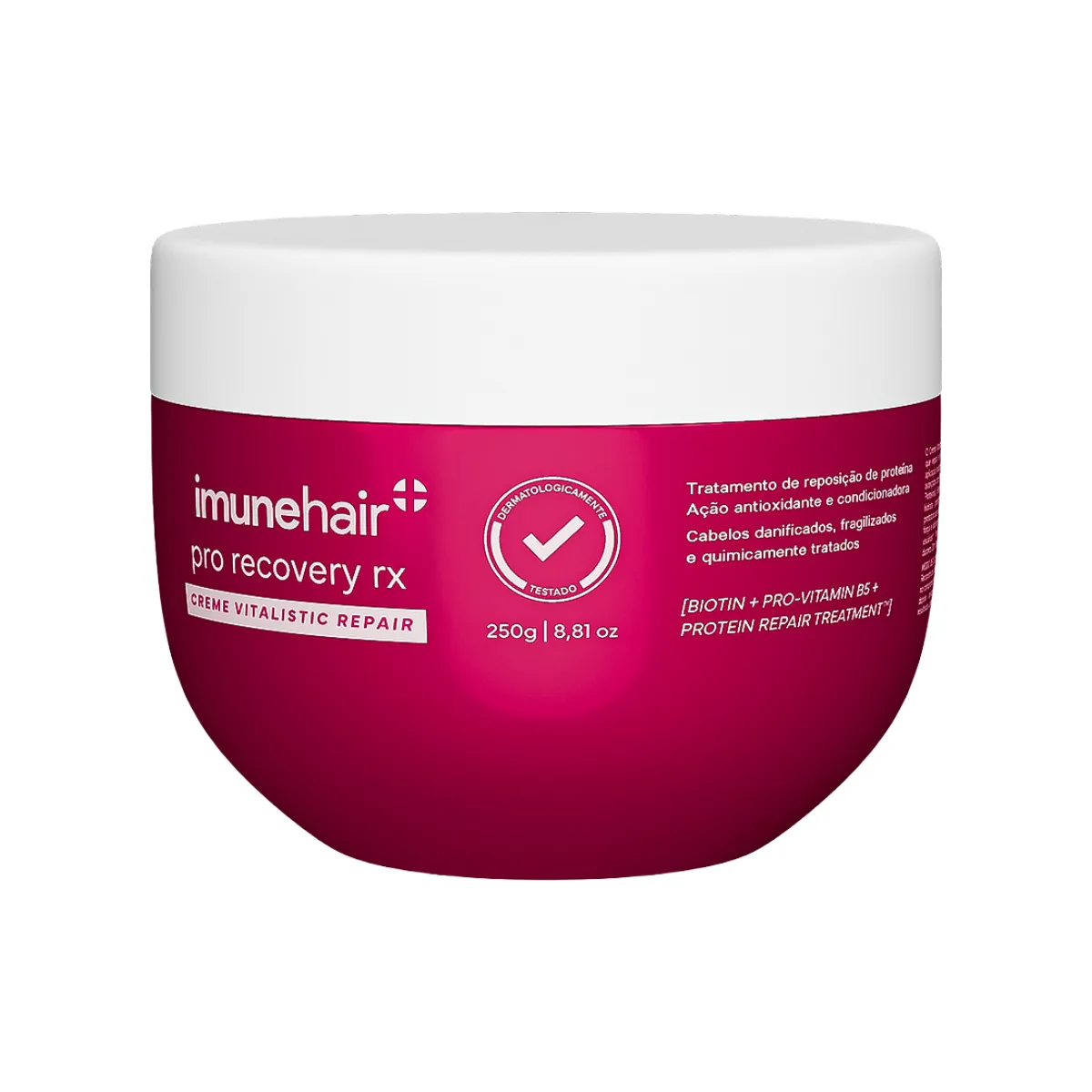O Creme Reparador ImuneHair Vitalistic Repair Pro Recovery é um creme de tratamento capilar desenvolvido para reparar e reestruturar os cabelos desde a primeira aplicação. Sua tecnologia atua na redução da quebra e na recuperação da fibra capilar, enquanto proporciona hidratação intensa e nutrição prolongada. Com blend de óleos, vitaminas e proteínas, forma uma película protetora que devolve força, brilho e maciez aos fios.