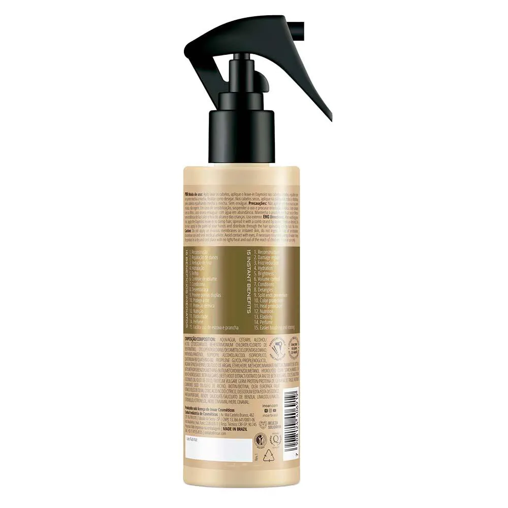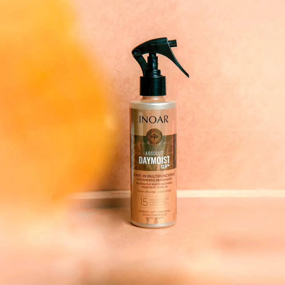 Com máximo poder de reconstrução, Inoar Absolut DayMoist Tratamento Multifuncional em spray oferece 15 benefícios imediatos para cabelos fragilizados ou danificados, cuidando dos fios enquanto age como finalizador.