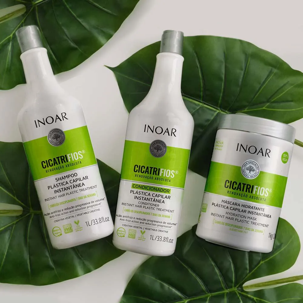 O condicionador Inoar Cicatrifios complementa o tratamento, hidratando, selando e protegendo os fios, proporcionando maciez, brilho e facilitando o processo de escovação.