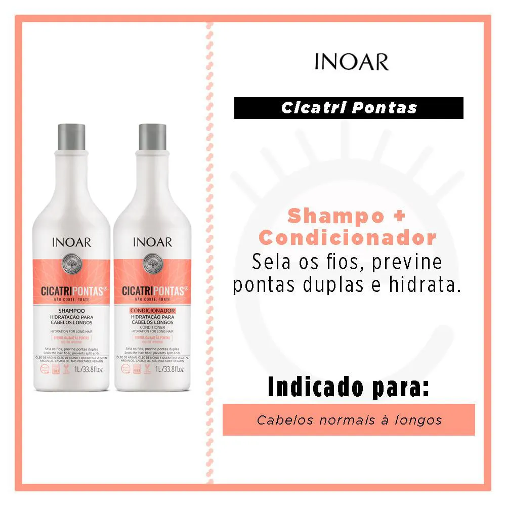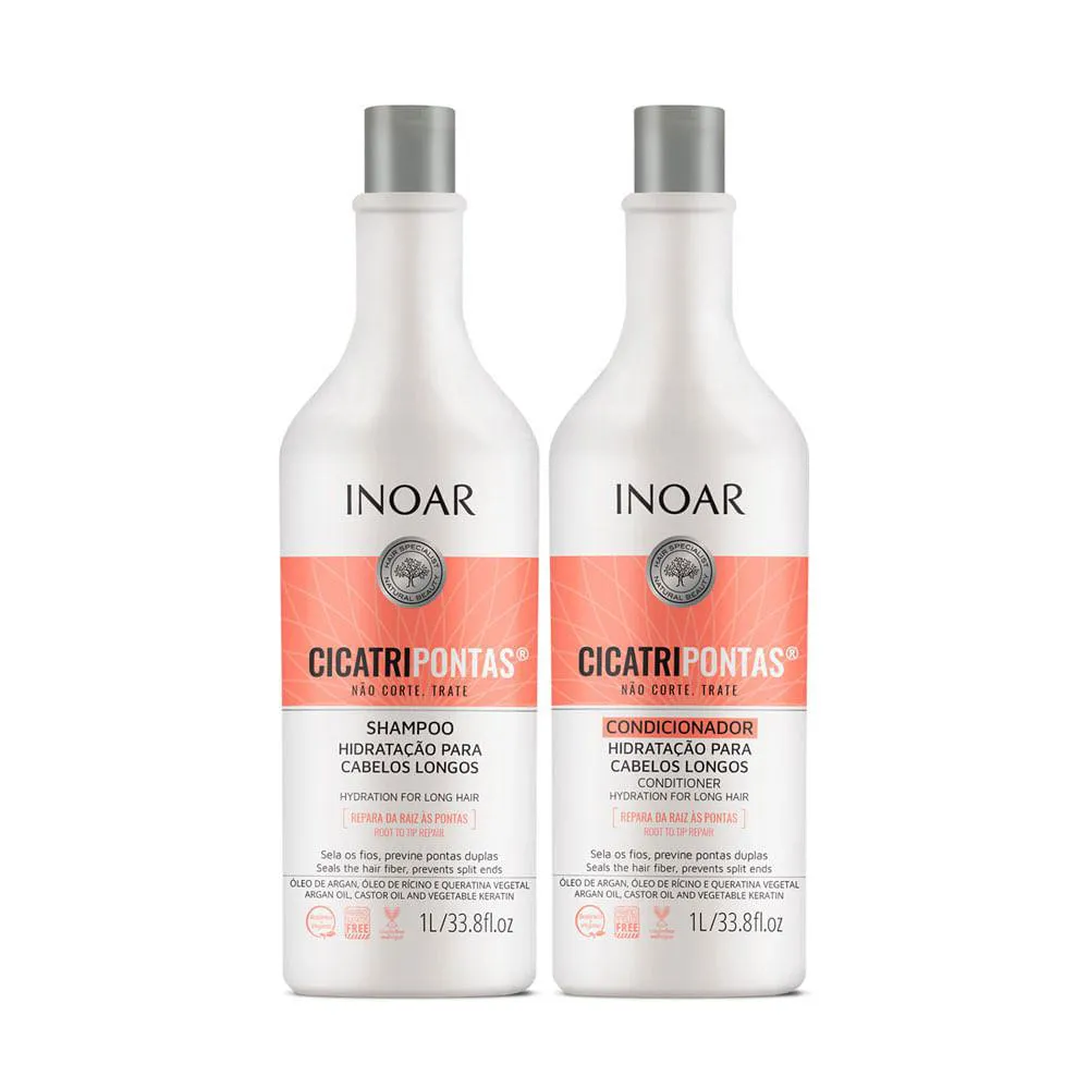 O kit de shampoo + condicionador Inoar CicatriPontas fornece hidratação para cabelos longos. Repara da raiz às pontas.