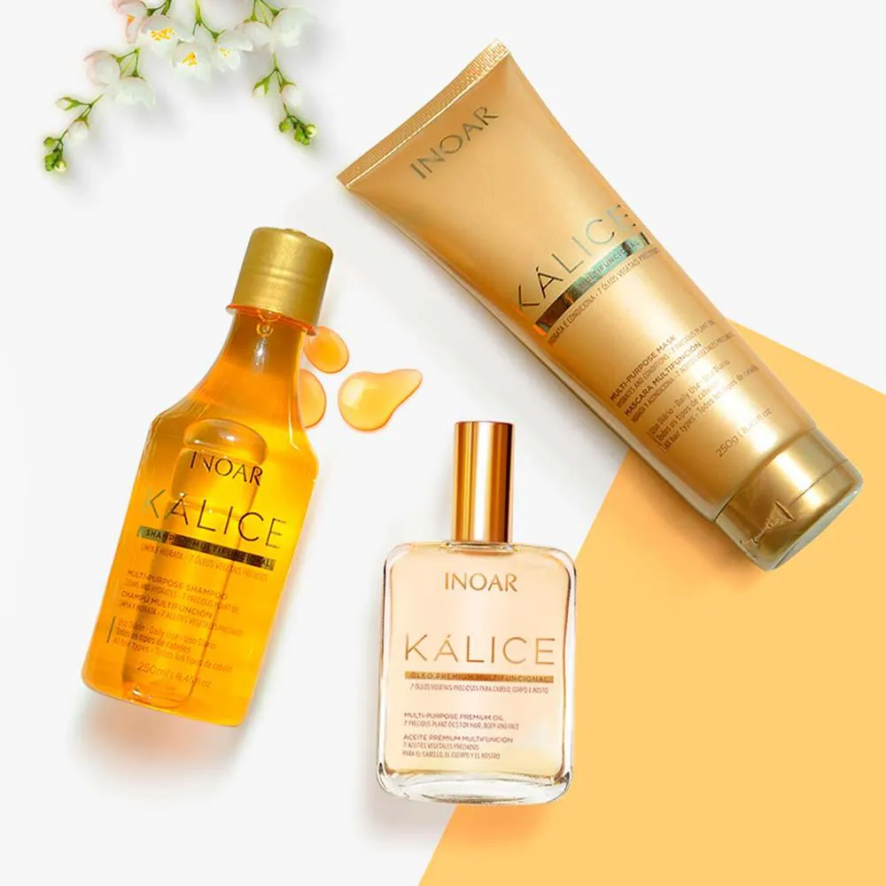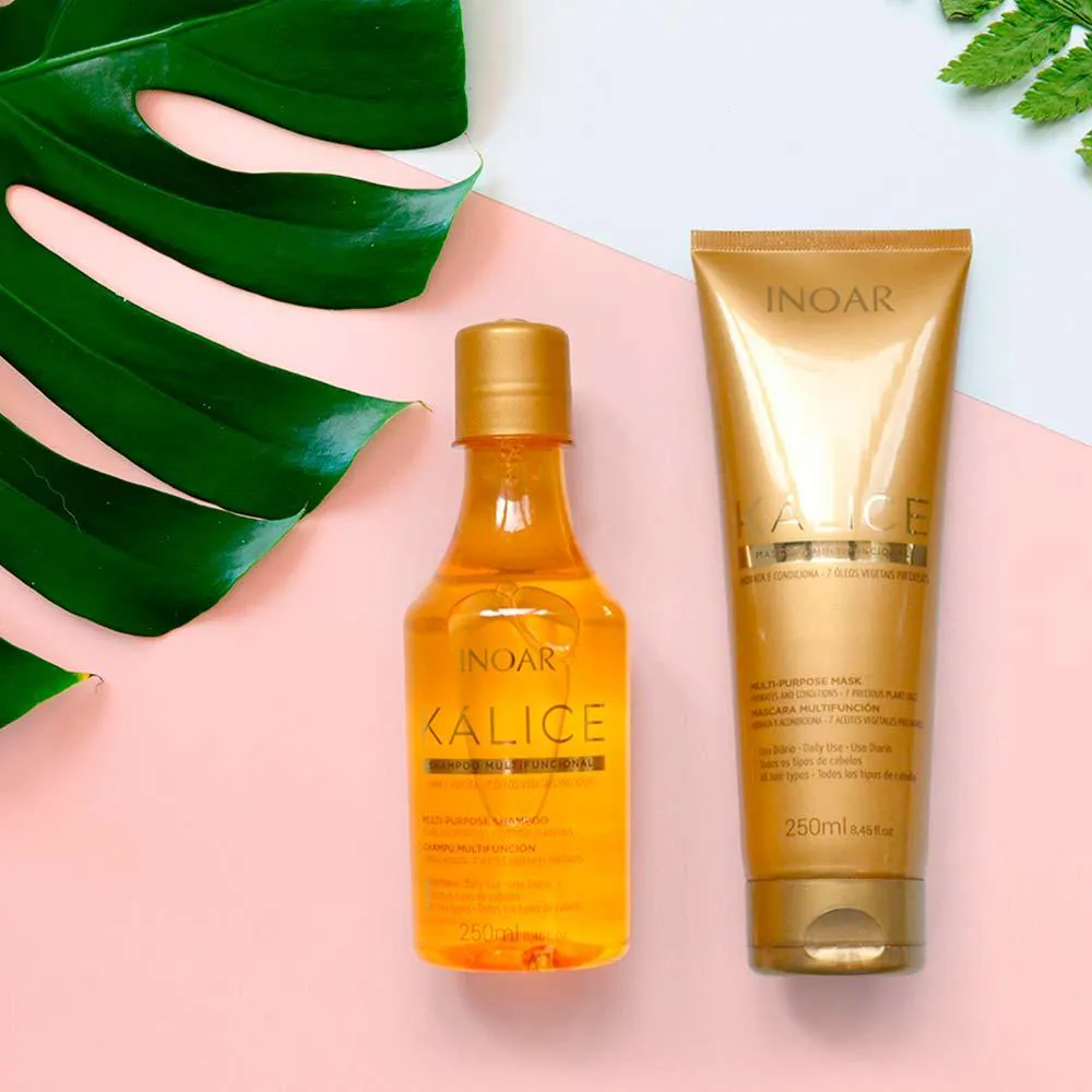 Após lavar os cabelos, aplique a máscara multifuncional Inoar Kálice nos fios úmidos massageando, faça uma pausa de 2 a 5 minutos, enxágue e finalize como desejar.