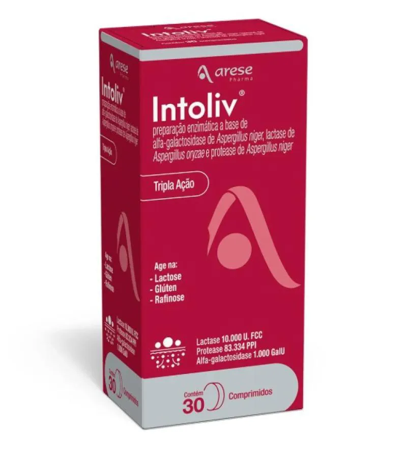 Intoliv é uma preparação enzimática em comprimidos, formulada com 3 enzimas específicas (lactase, alfa-galactosidase e protease) que atuam na digestão de alimentos, quebrando lactose, açúcares complexos e glúten presentes na dieta alimentar. Facilita a digestão de alimentos com lactose, glúten e açúcares complexos. Reduz gases, dores e inchaço abdominal. Converte lactose em açúcares mais fáceis de digerir. Quebra proteínas complexas do glúten, tornando-as mais digestíveis. Auxilia pessoas com dificuldades digestivas.