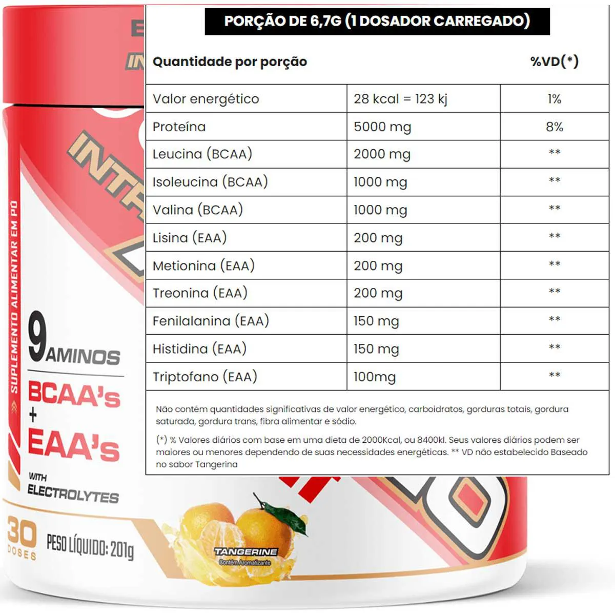 Leucina, Isoleucina, valina, Cloridrato de Lisina, Metionina, Treonina, Fenilalanina, Histidina, L-Triptofano, Citrato de magnésio, Citrato de sódio, regulador de acidez, citrato de potássio, aroma idêntico ao natural, acidulante ácido cítrico e edulcorante, sucralose. NÃO CONTÉM GLUTÉN ADVERTÊNCIAS