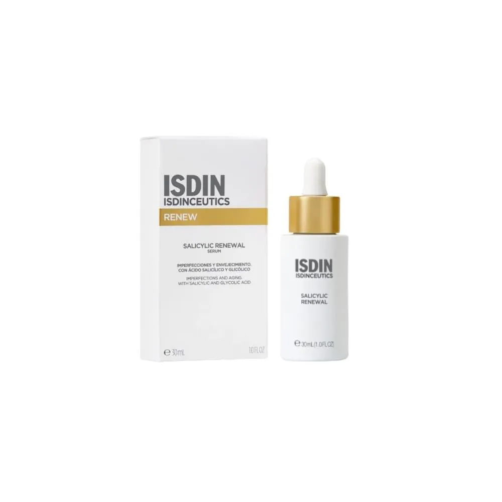 O Isdinceutics Salicylic Renewal Serum, da Isdin, é um sérum facial formulado com uma combinação eficaz de ácido salicílico, ácido glicólico e ativos renovadores que promovem uma esfoliação suave, desobstruem os poros e melhoram visivelmente a textura da pele. Com ação seborreguladora e renovadora, ajuda a reduzir imperfeições, minimizar os poros dilatados e prevenir o aparecimento da acne, deixando a pele mais uniforme, radiante e saudável. Sua textura leve e de rápida absorção é ideal para o uso diário, promovendo uma pele renovada sem ressecar ou irritar.