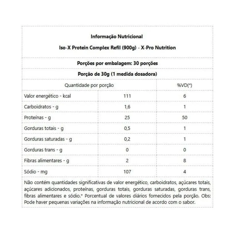 Iso-X Protein Complex Refil (900g) Experimente o poder do Iso-X Protein Complex, nosso suplemento proteico premium com proteína isolada, projetado especialmente para atletas e entusiastas de atividades físicas que desejam alcançar resultados excepcionais. Potencialize seu desempenho e alcance seus objetivos com a qualidade que você merece! Benefícios: - 25 gramas de proteínas, por dose;- Contém whey protein isolado do soro do leite;- Mais força e ganho de massa;- Baixo índice de carboidrato;- Rápida Absorção.