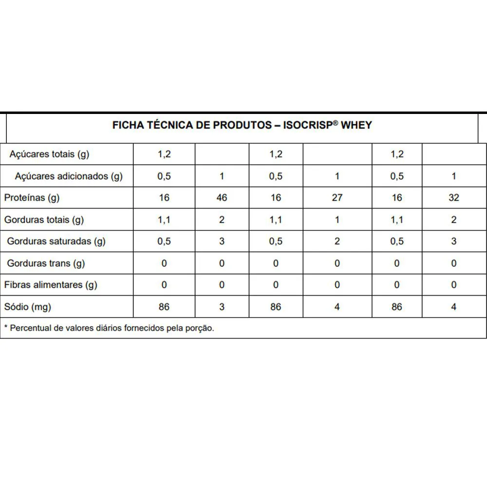 O Isocrisp Whey Protein Crisp é um suplemento alimentar em grânulos, composto por um blend proteico de Whey Protein Isolate e Whey Protein Concentrate, apresentado na forma de flocos esféricos e crocantes de cor creme pálido. É elaborado com proteínas de soro do leite, incluindo componentes como glicomacropeptídeo, imunoglobulina e lactoferrina.