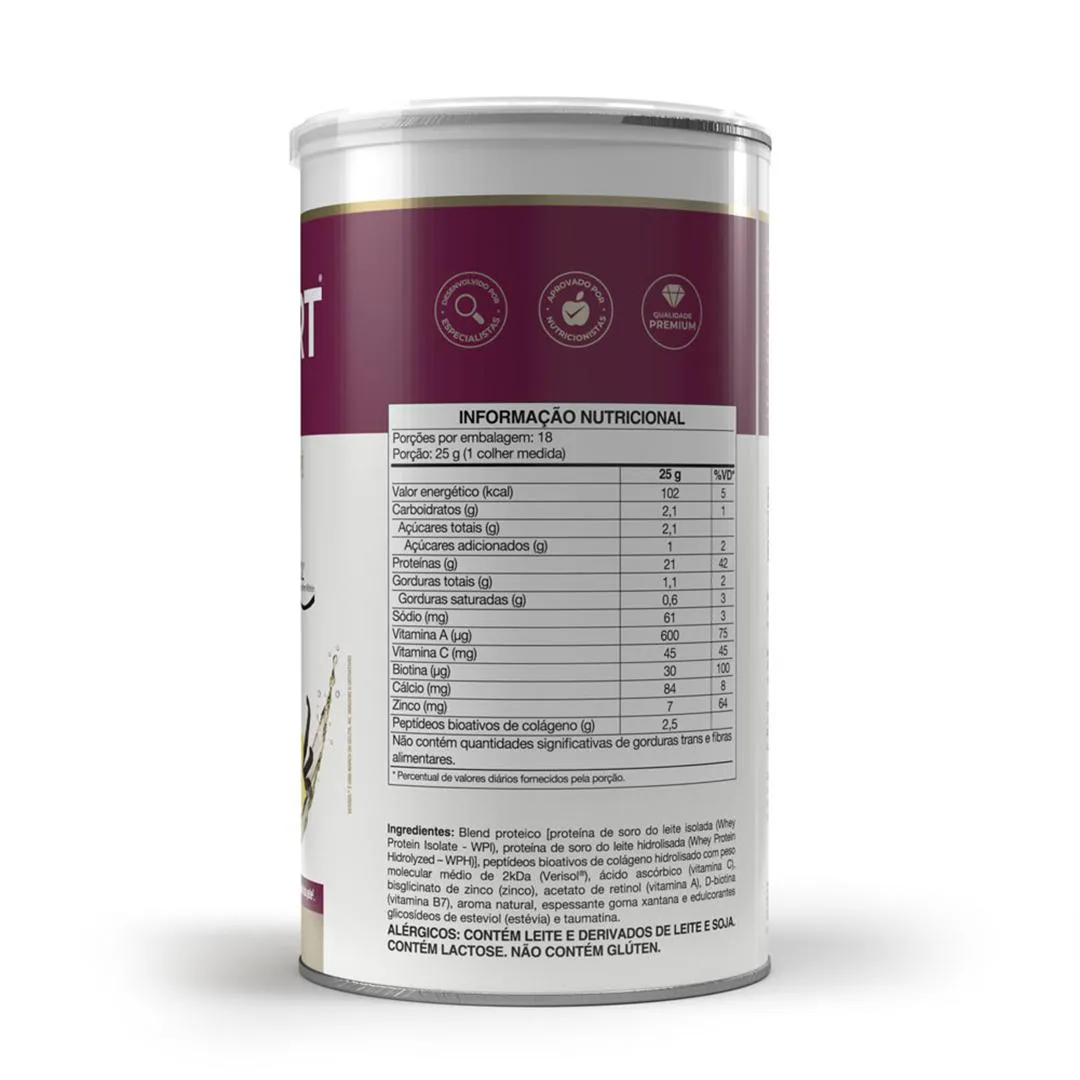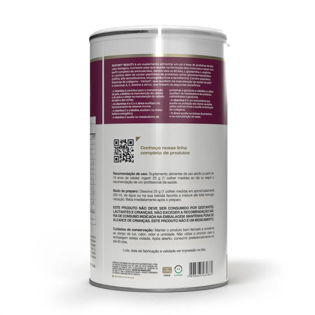ISOFORT® BEAUTY é um suplemento alimentar composto de proteínas de alto valor biológico e possui aminoácidos dentre eles os BCAAs, L-glutamina, L-arginina e L-prolina, além de conter peptídeos de proteínas como: glicomacropeptídeos (GMPs), alfa-lactoalbumina, imunoglobulinas e lactoferrina. Os peptídeos bioativos de colágeno hidrolisado com peso molecular médio de 2kDa auxiliam na manutenção da saúde da pele. ISOFORT® BEAUTY Vitafor é a combinação inteligente de proteínas de alta digestibilidade e absorção: Proteína Isolada do soro do leite (Whey Protein Isolate - WPI) e proteína hidrolisada soro do leite (Whey Protein Hidrolyzed - WPH), nutriente esse que auxilia na formação dos músculos e ossos1, além de conter Peptídeos Bioativos de Colágeno – Verisol®, que auxiliam na manutenção da saúde da pele2, associados a vitaminas A, C, Biotina (B7) e o mineral Zinco. A combinação para te auxiliar no cuidado dos músculos e da pele. Proteína, colágeno Verisol ®, vitaminas e minerais em um único lugar é com: ISOFORT® BEAUTY. Benefícios do produto: