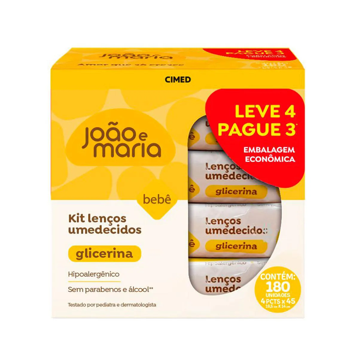 Kit Lenço Umedecido João e Maria Bebê Glicerina 4 pacotes com 45 unidades cada