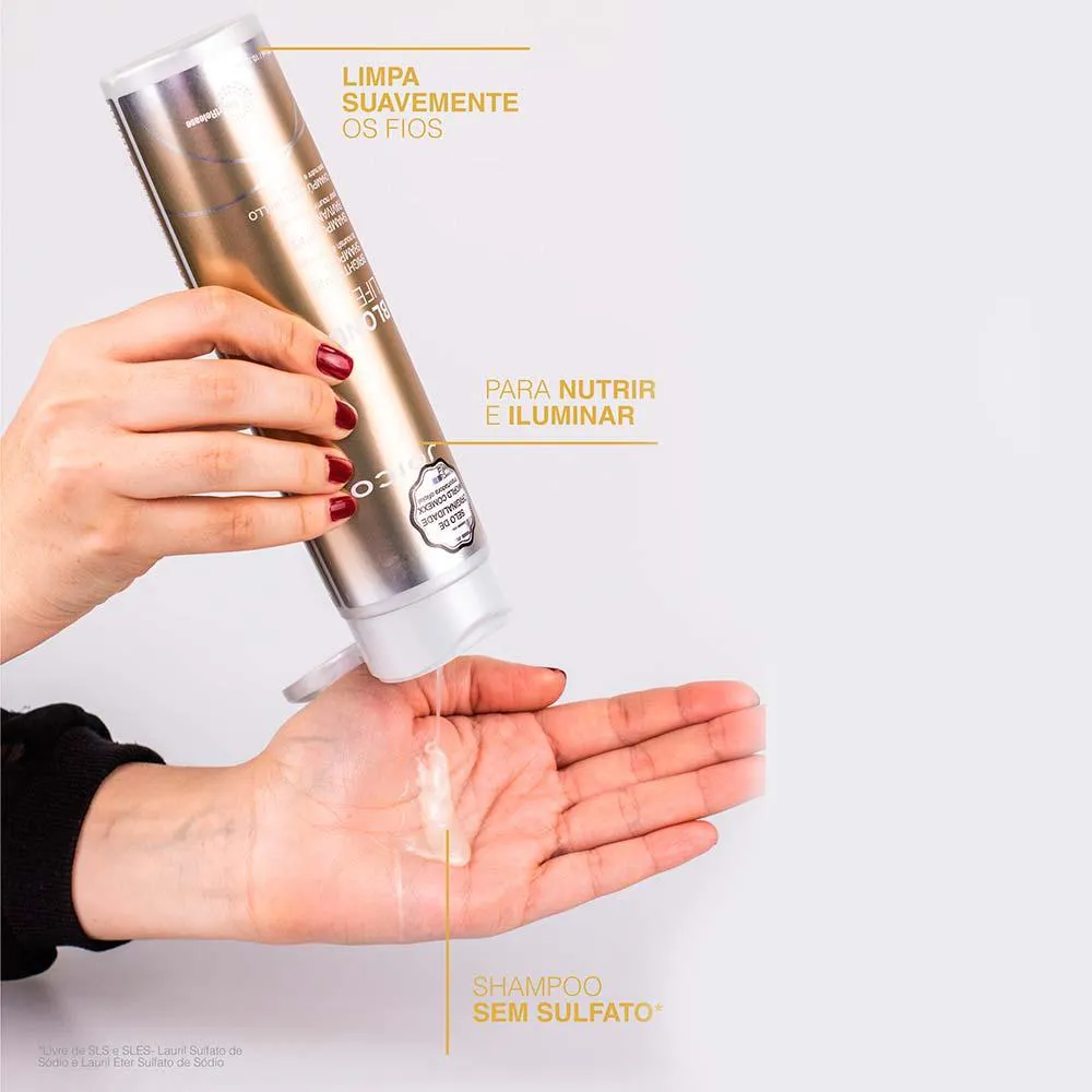 O shampoo Blonde Life Brightening sem sulfato, proporciona uma limpeza extraordinária e ativa o brilho, produzindo uma espuma única, restaurando o pH ideal do cabelo.