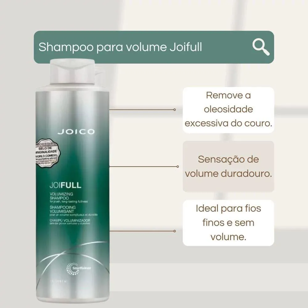 Joico Joifull Volumizing Smart Release - shampoo 1000ml Tratamento para cabelos finos. Joico Joifull Volumizing ajuda a fortalecer e nutrir o cabelo, além de aumentar o volume com resultado duradouro. Joico Joifull Volumizing apresenta uma fórmula inovadora que garante volume, elasticidade e corpo, deixando os cabelos mais densos, maleáveis e cheios de vida. Contém: Joico Joifull Volumizing - Shampoo 1000ml: controla a oleosidade, remove as impurezas e aumenta o volume instantaneamente, além de contar com espuma luxuosamente cremosa.