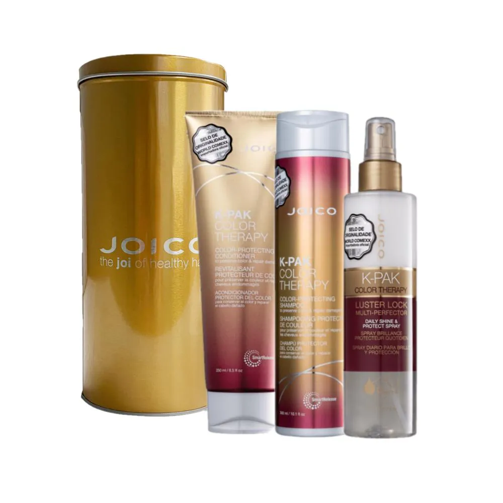 Kit de tratamento para cabelos coloridos. Kit Joico K-PAK Color Therapy Smart Release promove tratamento intensivo para garantir cor vibrante, protegida e duradoura. Kit Joico K-PAK Color Therapy Smart Release conta com fórmula que limpa suavemente, hidrata, nutre, auxilia na proteção da cor e restauração dos fios, além de proporcionar brilho intenso, melhorar a elasticidade e deixar os fios mais fortes. Contém Joico K-PAK Color Therapy Smart Release - shampoo 300ml: limpa suavemente, auxilia na proteção da cor e restauração dos fios. Joico K-PAK Color Therapy Smart Release - condicionador 250ml: reverte os danos causados pelo tempo, protege a cor e ilumina, hidrata e condiciona intensamente, além de garantir maleabilidade, força e elasticidade. Joico lata dourada- é uma combinação perfeita de beleza e funcionalidade. Além de ser um item esteticamente atraente, é também uma ótima opção para armazenar seus produtos Joico favoritos. Garanta já a sua lata dourada Joico. O Óleo capilar Joico K-PAK Color Therapy Luster Lock Smart Release foi especialmente desenvolvido para tornar a sua rotina de cuidados capilares muito mais prática, segura e eficiente. Com formulação poderosa e ingredientes de alta performance, o produto é ideal para manter a sua coloração viva e radiante por muito mais tempo. Conselho de Aplicação Aplique a quantidade necessária de shampoo de acordo com o comprimento dos fios. Massageie até obter espuma e enxágue bem. Repita a aplicação caso seja necessário. Passe a máscara nos cabelos limpos e úmidos. Pause de 2 a 5 minutos e enxágue. Pode ser usada como pré-shampoo: aplique nos cabelos secos, pausando de 2 a 5 minutos. Enxágue e lave com shampoo e condicionador. Aplique uma pequena quantidade de condicionador sobre o comprimento e as pontas. Deixe agir de 1 a 2 minutos e, por fim, enxágue completamente.Em eguida aplique de 1 a 2 doses de leave-in sobre os cabelos úmidos. Em seguida, penteie bem e finalize com o uso do secador.