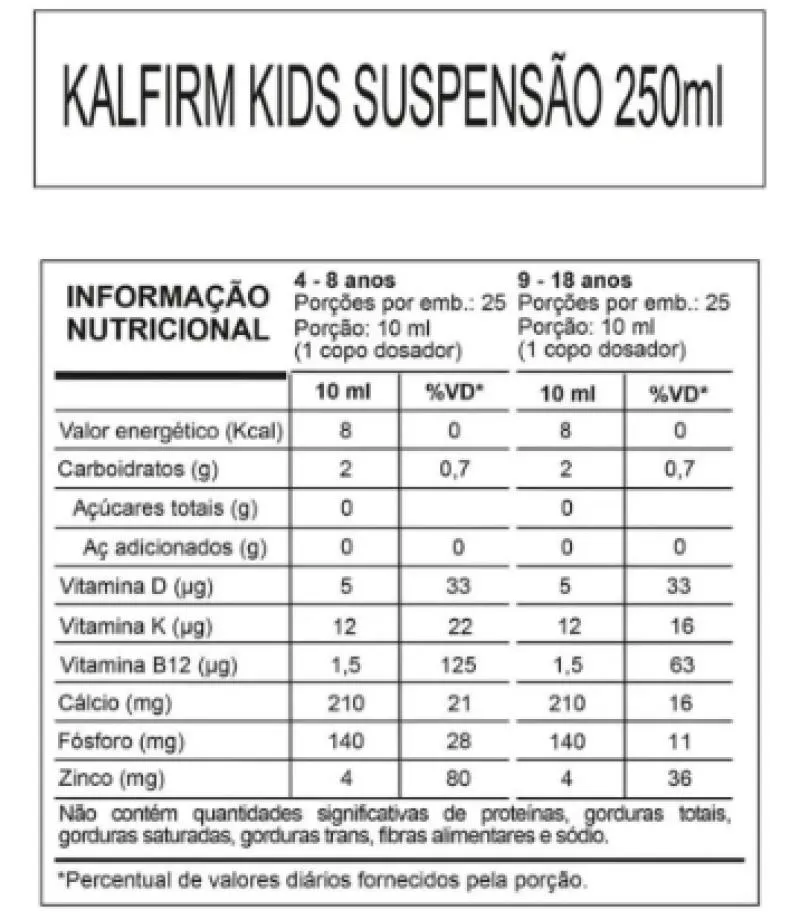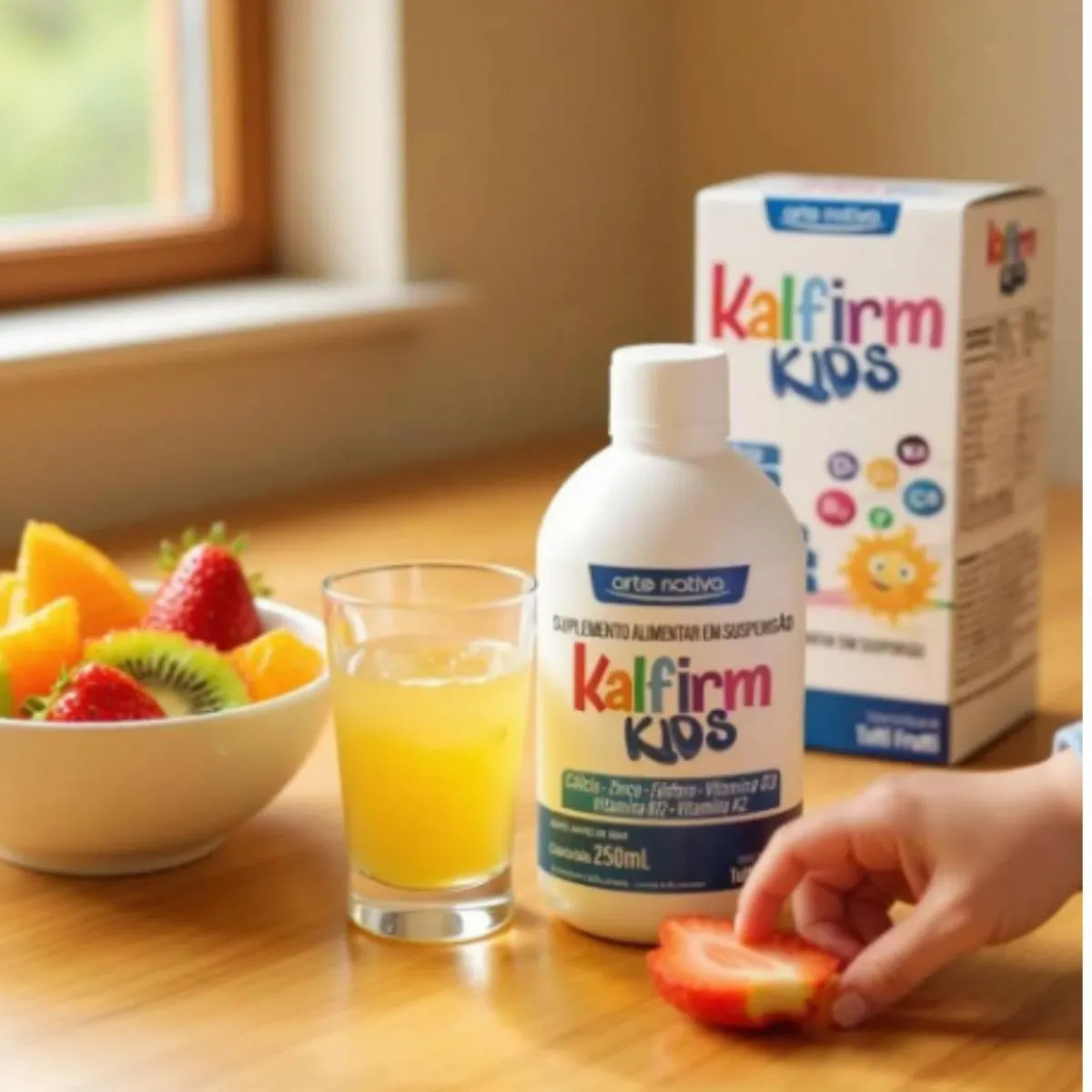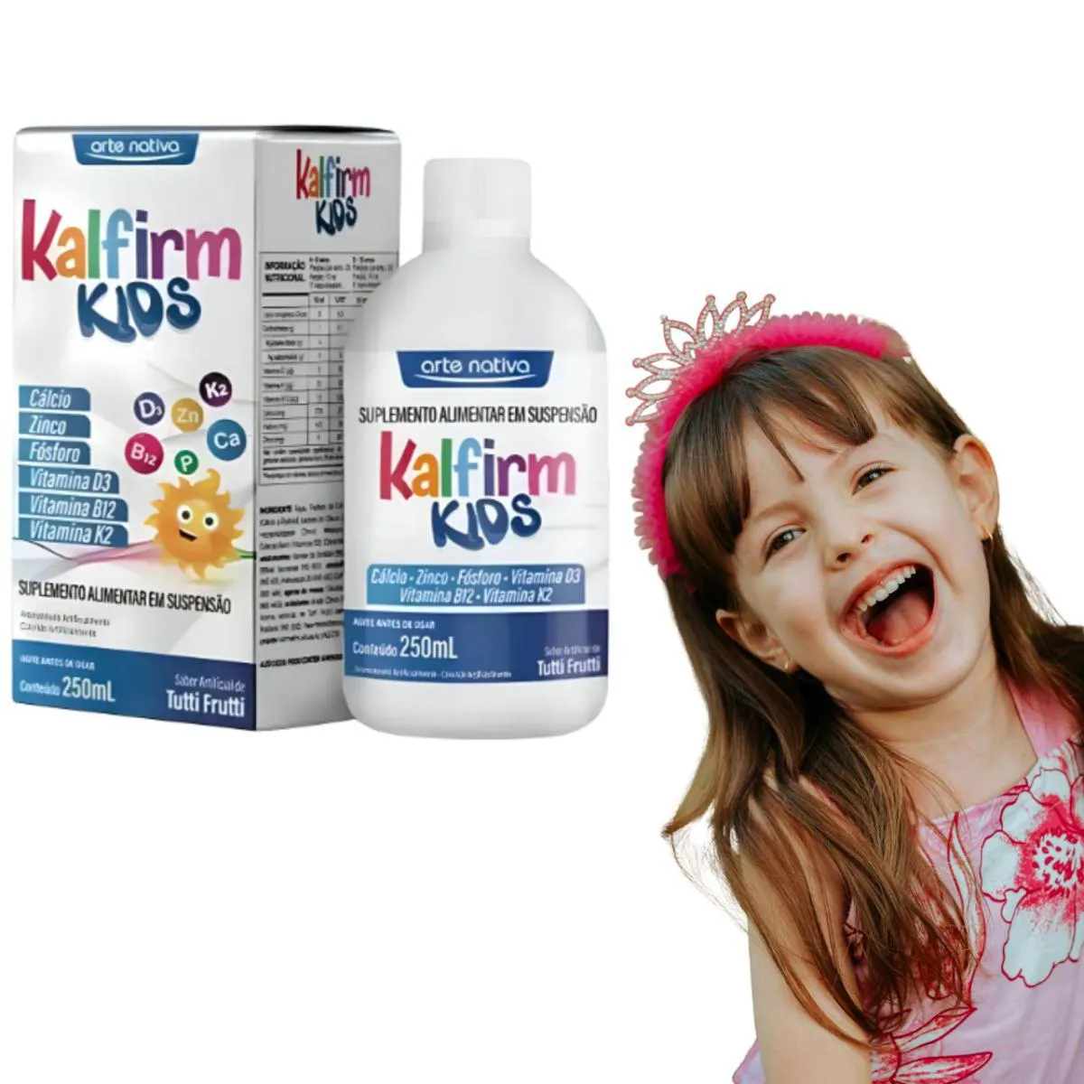 Kalfirm Kids 250ml Solução Oral Suplemento infantil com Vitaminas e mineraisO suplemento alimentar Kalfirm Kids 250ml foi desenvolvido pela Arte Nativa para complementar a alimentação infantil de forma segura e equilibrada Sua fórmula líquida contém Cálcio Zinco Fósforo Vitaminas B12 D3 e K2 nutrientes essenciais para o crescimento saudável desenvolvimento dos ossos e fortalecimento do sistema imunológico das criançasBenefícios• Auxilia na formação e manutenção de ossos e dentes• Contribui para o crescimento adequado e saudável• Fortalece o sistema imunológico• Ajuda no metabolismo energético• Sem glúten e sem adição de açúcaresComposição• Solução líquida com Cálcio Zinco Fósforo Vitaminas B12 D3 e K2• Sem glúten• Sem açúcarModo de usoAgitar antes de usarIngerir a quantidade indicada na embalagem ou conforme orientação médica ou nutricionalAdministrar por via oralConservar em local seco ao abrigo da luz e do calorApresentaçãoFrasco com 250mlPode conter traços de amendoim leite e soja