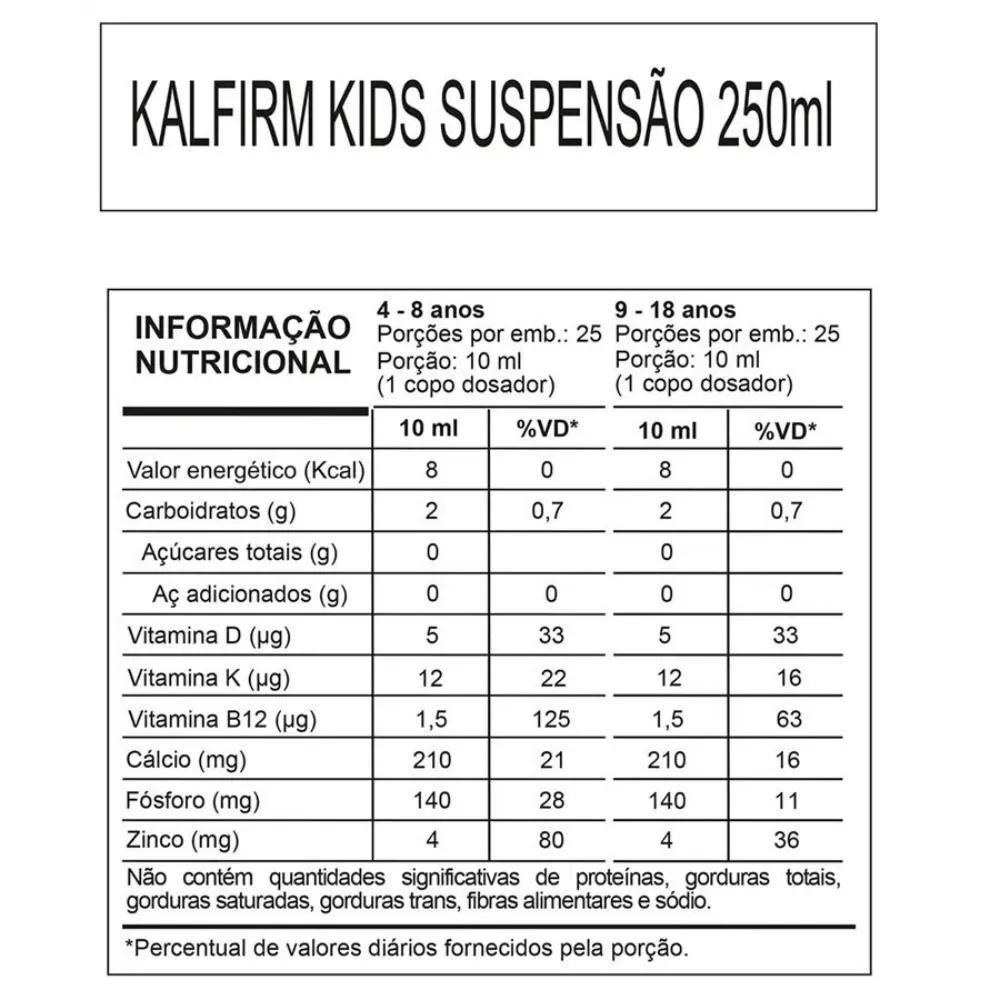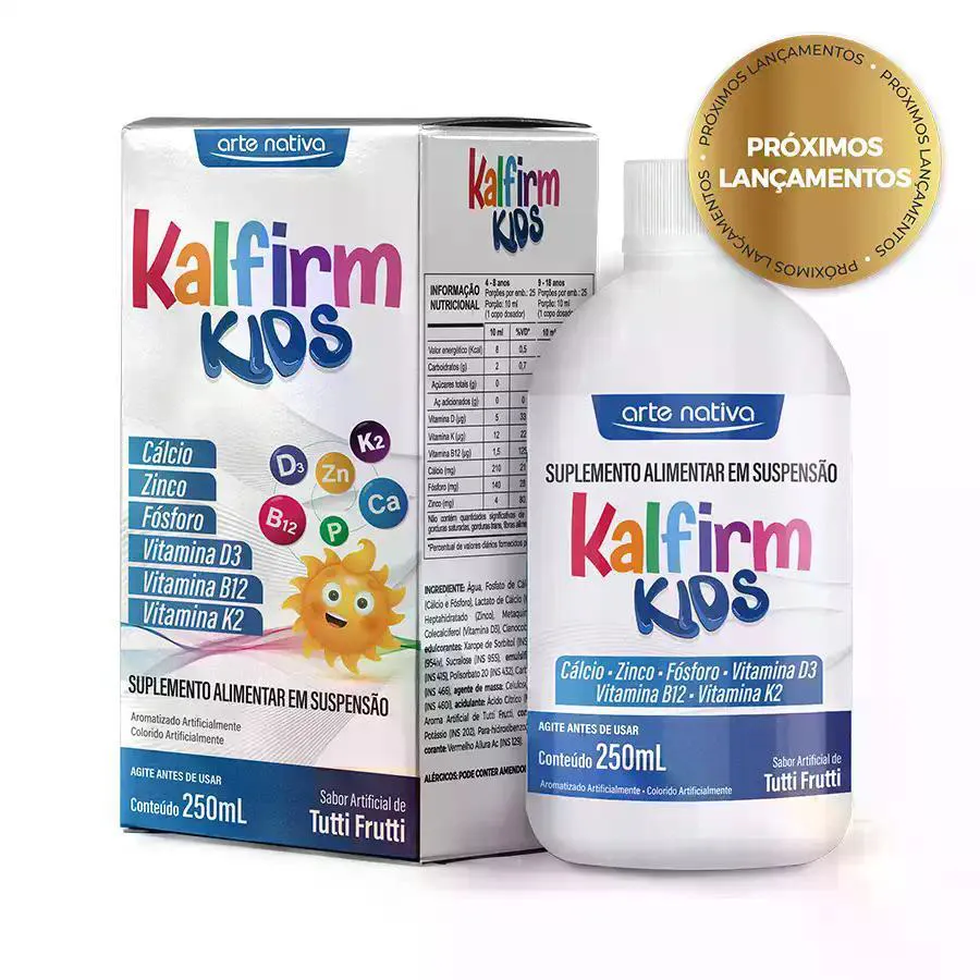 Kalfirm Kids 250ml Suplemento Alimentar infantil com Cálcio Arte NativaO Kalfirm Kids é um suplemento alimentar em solução líquida desenvolvido pela Arte Nativa, com cálcio e outros nutrientes importantes para complementar a alimentação infantil. Produto sem glúten e sem adição de açúcares.Suplemento Kalfirm Kids Cálcio, Zinco, Fósforo, B12, D3 e K2 Arte Nativa - 250mLApresentação: frasco com 250ml.