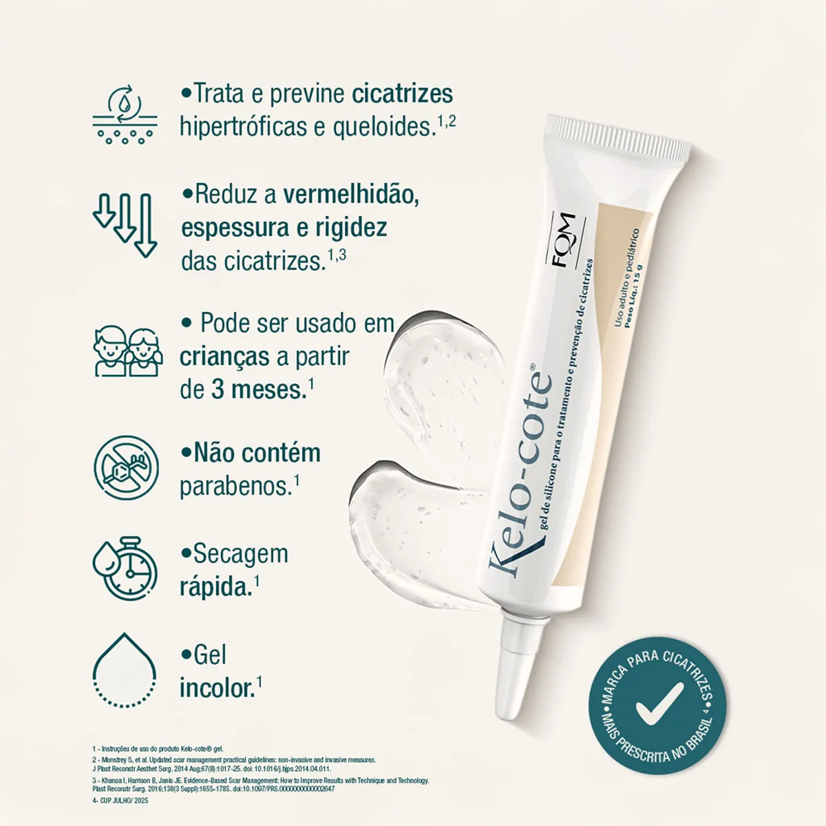 Kelo-Cote é um gel com 100% de silicone, considerado referência no tratamento e prevenção contra cicatrizes hipertróficas e quelóides. Com ótima adesão à pele e secagem rápida, uma bisnaga de Kelo-Cote já pode ser o suficiente para tratar uma cicatriz de até 10cm (se usado corretamente), entre 2 e 3 meses, que é o tempo que geralmente se leva para completar o tratamento.