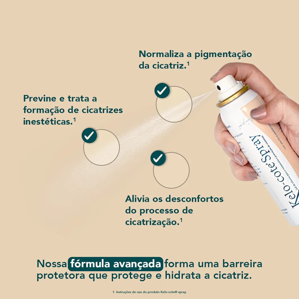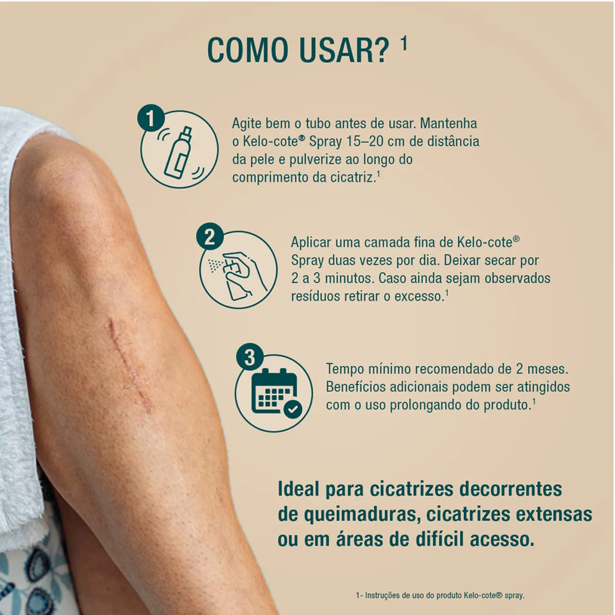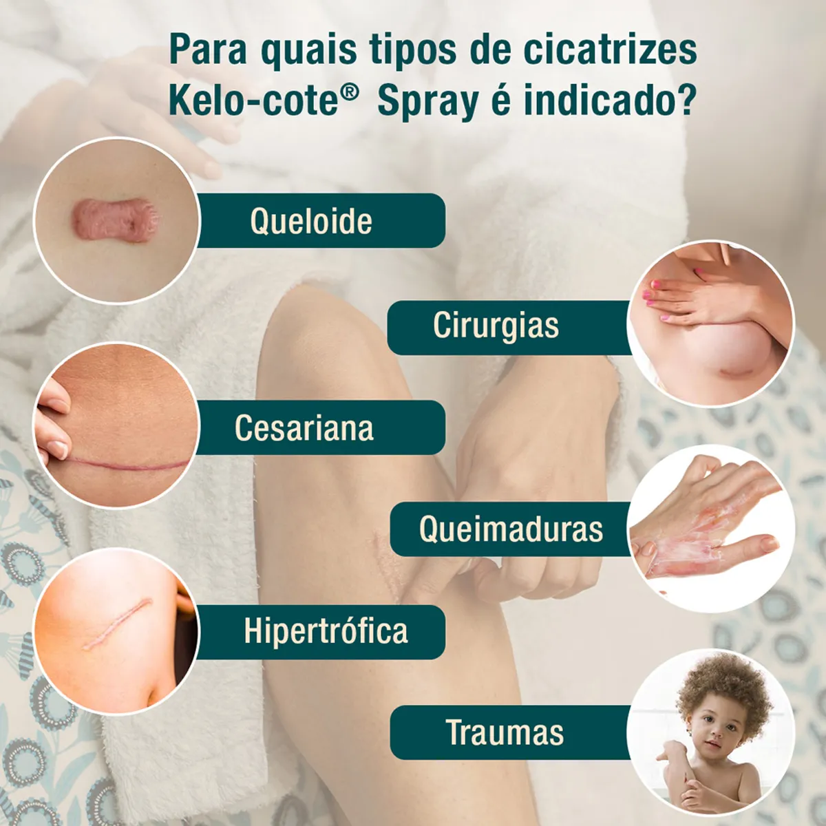 É indicado para o tratamento de cicatrizes hipertróficas ou queloides, geralmente causadas por cirurgias, queimaduras ou outras lesões. Kelo-Cote Spray tem em sua composição polisiloxanos e dióxido de silicone, ativos que ajudam a regeneração das cicatrizes, aliviando também a coceira e o desconforto, comuns durante o processo de cicatrização.