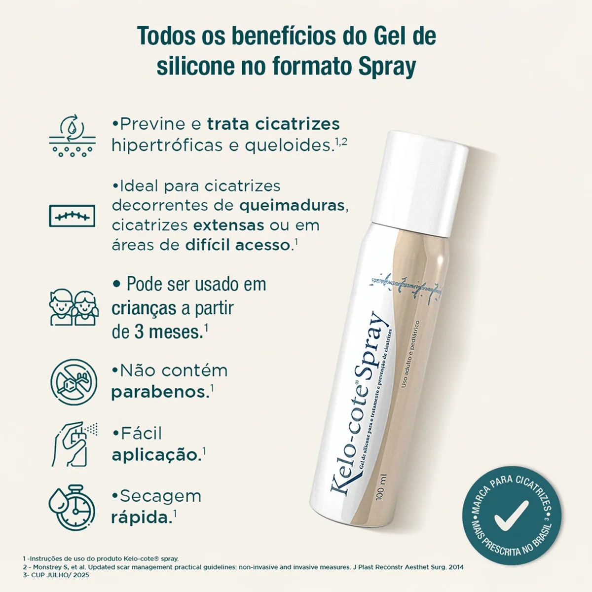 Kelo-Cote é um gel com 100% de silicone e formato Spray, considerado referência no tratamento e prevenção contra cicatrizes hipertróficas e quelóides.
