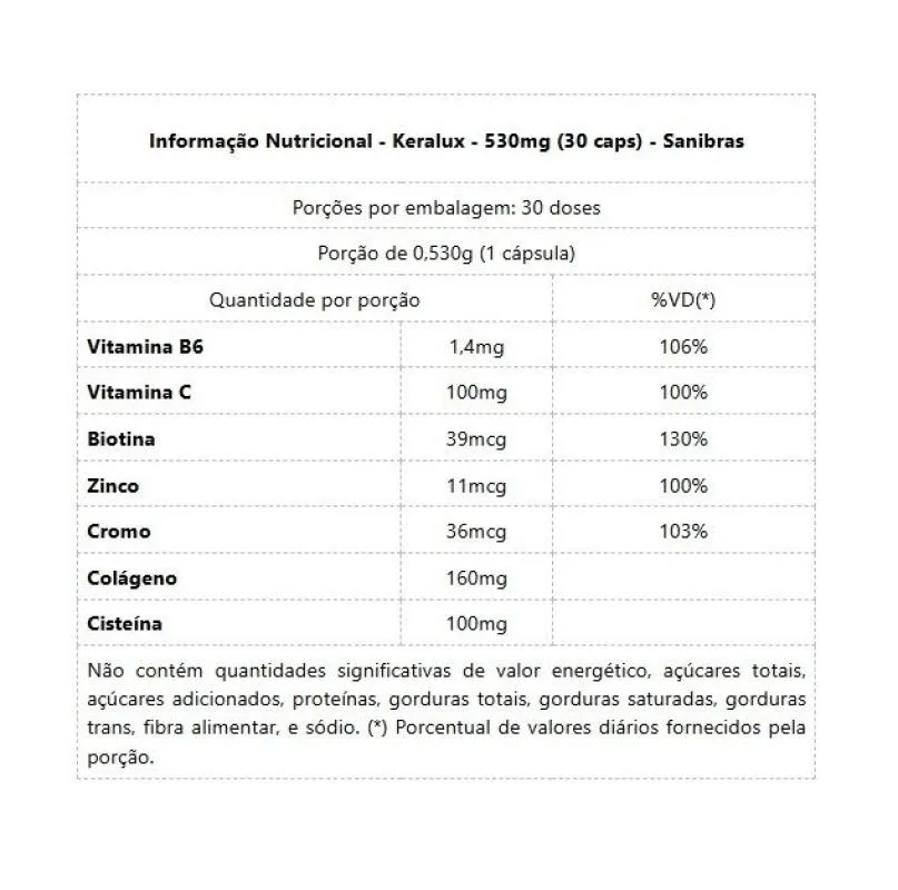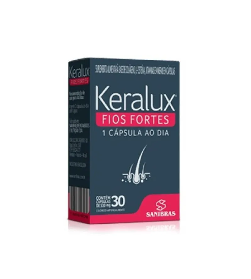 Keralux - 530mg (30 caps) - SANIBRAS Keralux, fios fortes com somente uma cápsula ao dia. 85% do nosso cabelo é queratina, e a sua falta resulta em cabelos secos e com queda acentuada.- CONHEÇA ABAIXO OS SEUS COMPONENTES:Vitamina B6: Ajuda na produção de queratina, proteína que forma a estrutura do cabelo e da barba.vitamina c: É um antioxidante que ajuda a proteger os fios contra danos.Biotina: É essencial para a produção de queratina e para a saúde dos folículos capilares.Zinco: Ajuda a manter a saúde dos folículos capilares e a prevenir a queda de cabelo.Cromo: Ajuda a regular os níveis de açúcar no sangue, o que pode ser benéfico para a saúde do cabelo e da barba.colágeno: É a proteína mais abundante no corpo e é essencial para a saúde do cabelo e da barba.Cisteína: É um aminoácido que é essencial para a produção de colágeno.