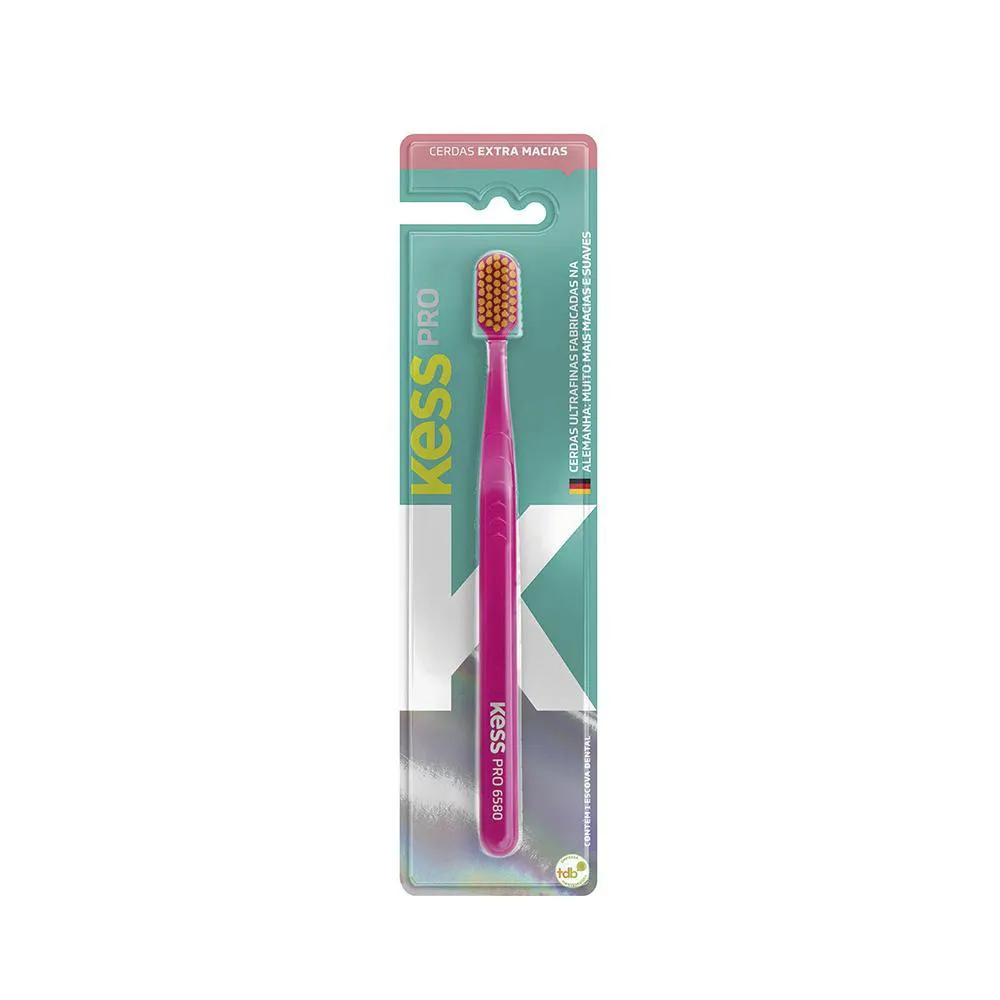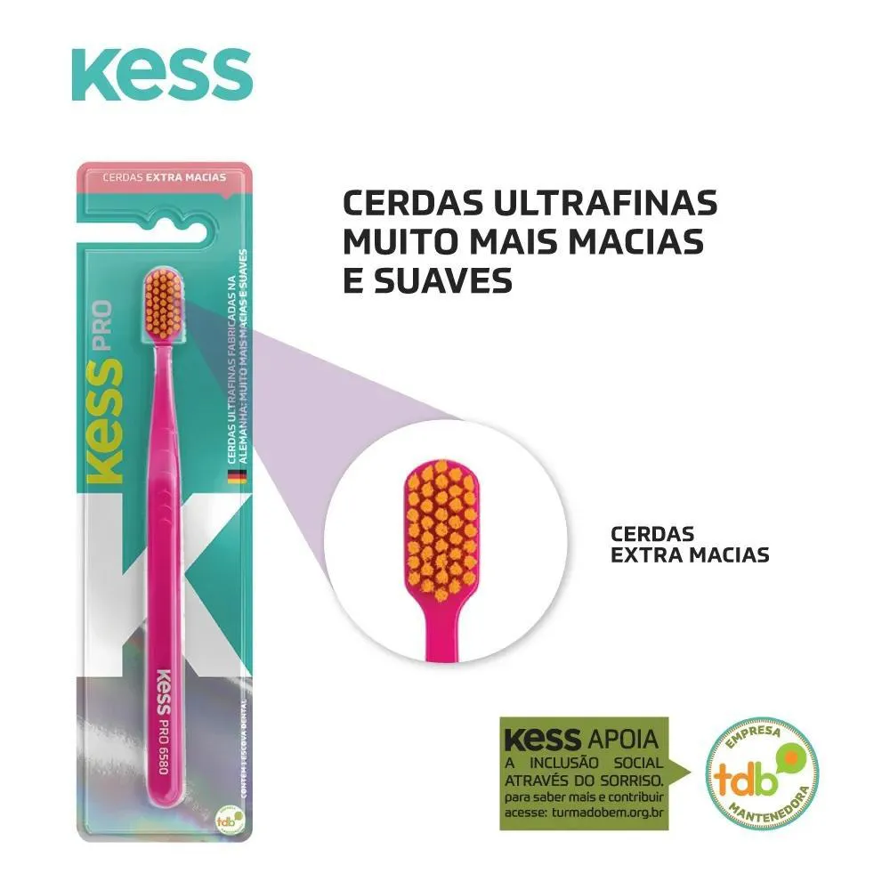 CORES SOTIDASescova Dental KESS Pro Extra Macia é projetada para oferecer a melhor experiência em cuidado bucal. Com um número superior de cerdas ultrafinas e macias, ela proporciona uma limpeza profunda, alcançando áreas inacessíveis por escovas comuns. Fabricadas com material importado da Alemanha, suas cerdas são tão finas quanto um fio de cabelo, garantindo uma escovação mais eficiente e confortável. O cabo reto com cabeça angulada e a capa protetora de cerdas são detalhes que fazem a diferença no dia a dia de quem busca uma higiene bucal premium.