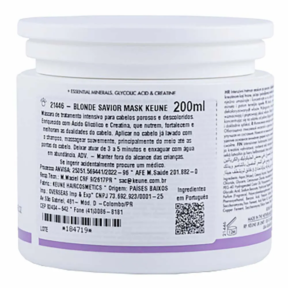 A Máscara Blonde Savior faz parte da linha de tratamento Blonde Savior, desenvolvida especialmente para cabelos sensibilizados, danificados e descoloridos. Assim como nos demais produtos da linha, a máscara conta com Ácido Glicólico e Creatina como ingredientes principais. Enquanto o ácido glicólico atrai água para o fio, mantendo-o hidratado, a Creatina fortalece as ligações dentro do fio de cabelo, recuperando sua saúde e força.